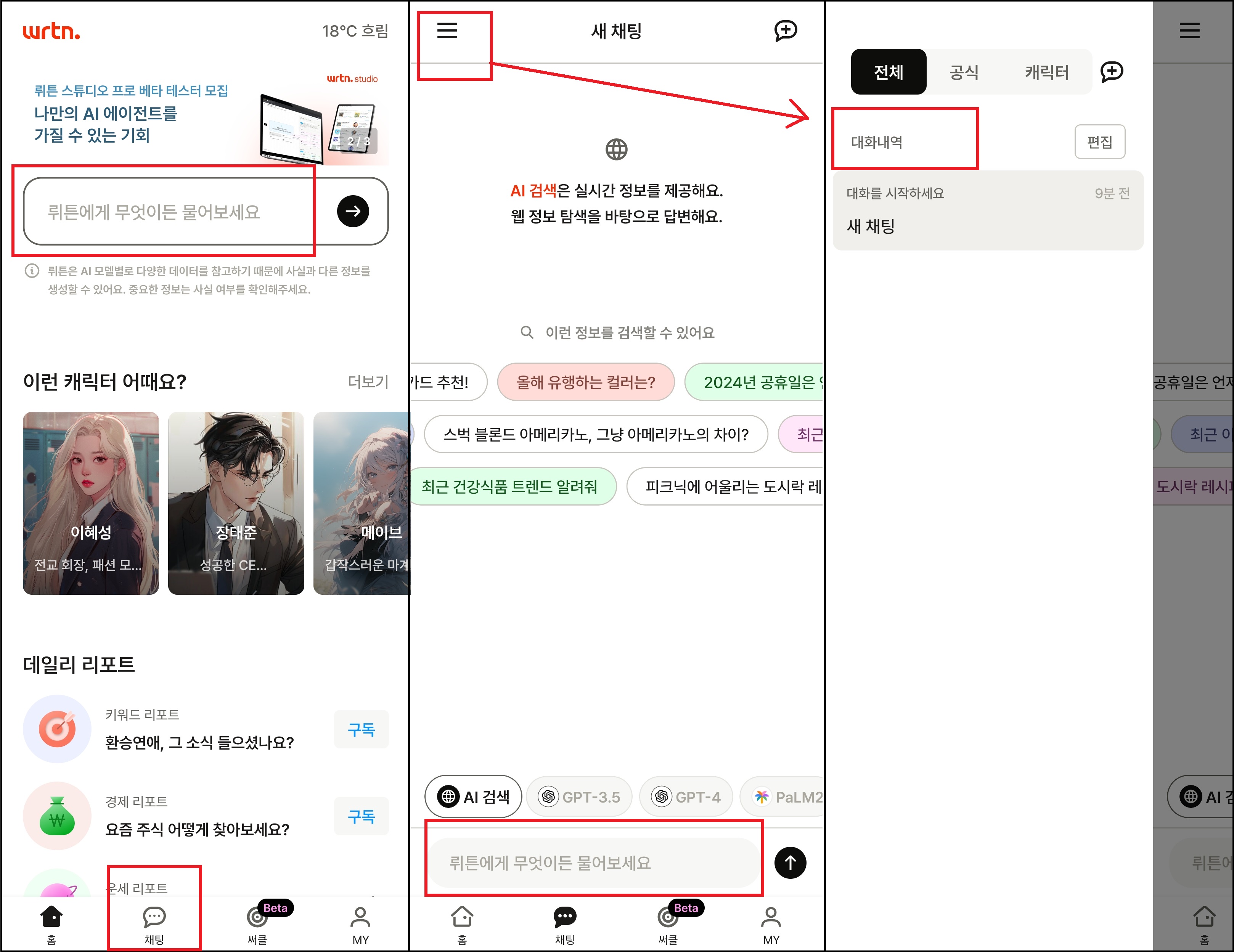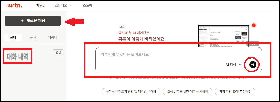대부분 대화형 인공지능 서비스는 마치 SNS 대화창을 사용하는 것과 비슷합니다. 다만 상대가 인공지능이라는 차이점이 있는 것입니다. 그렇듯 대부분 화면이 비슷한데요. 예를 들어 뤼튼(Wrtn)의 홈화면을 보겠습니다.