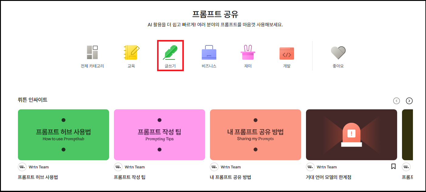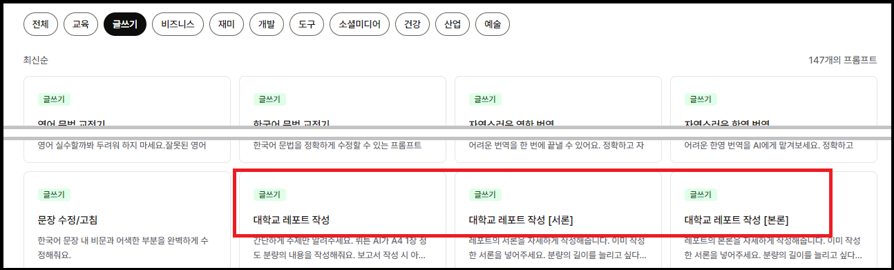 프롬프트 공유 화면으로 오면 상단에 카테고리가 나오는데요. 레포트 프롬프트를 보기 위해서 글쓰기 카테고리를 클릭합니다.
