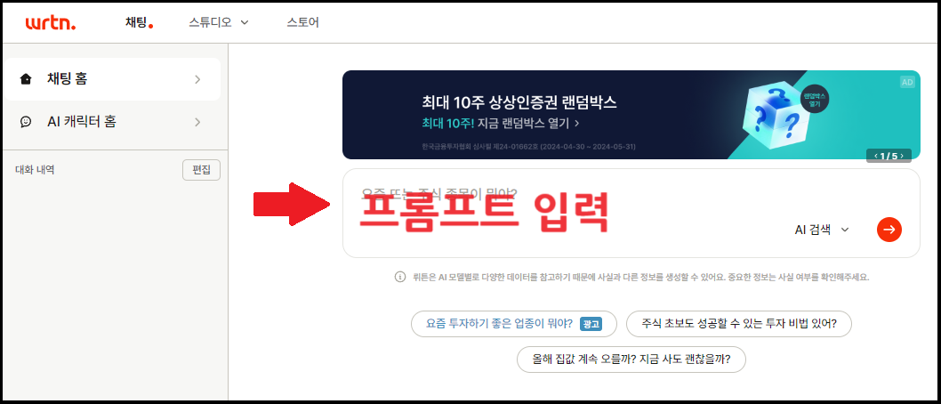 먼저 뤼튼의 홈화면을 보면 일반적으로 사용하는 입력창이 보일 것입니다. 보통은 이곳에 바로 질문이나 명령어를 입력하게 됩니다. (프롬프트 입력)