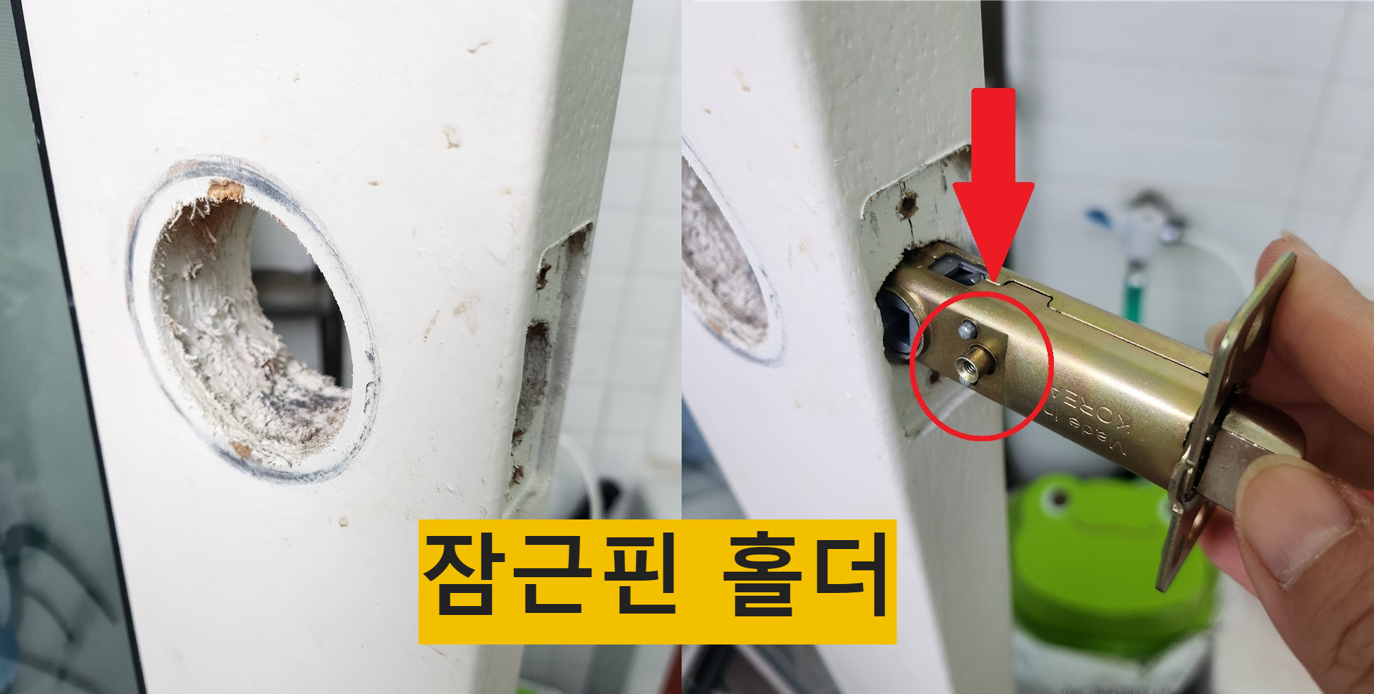 그렇게 문 옆의 래치 고정판을 나사로 고정해 주고 걸림쇠를 끼워주는데요. 끼울 때로 뺄 때와 같이 고정볼을 눌러서 끼워줍니다.