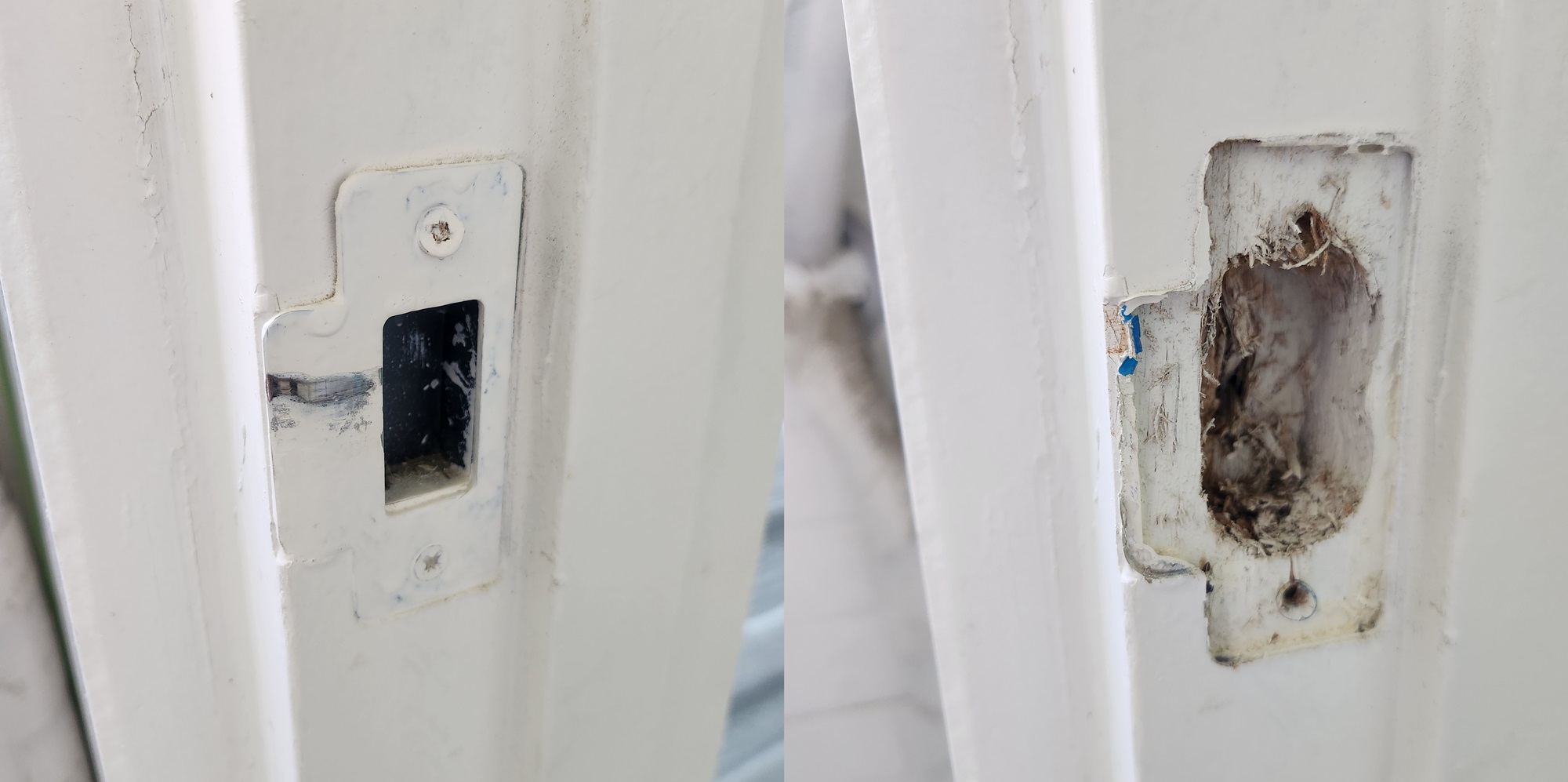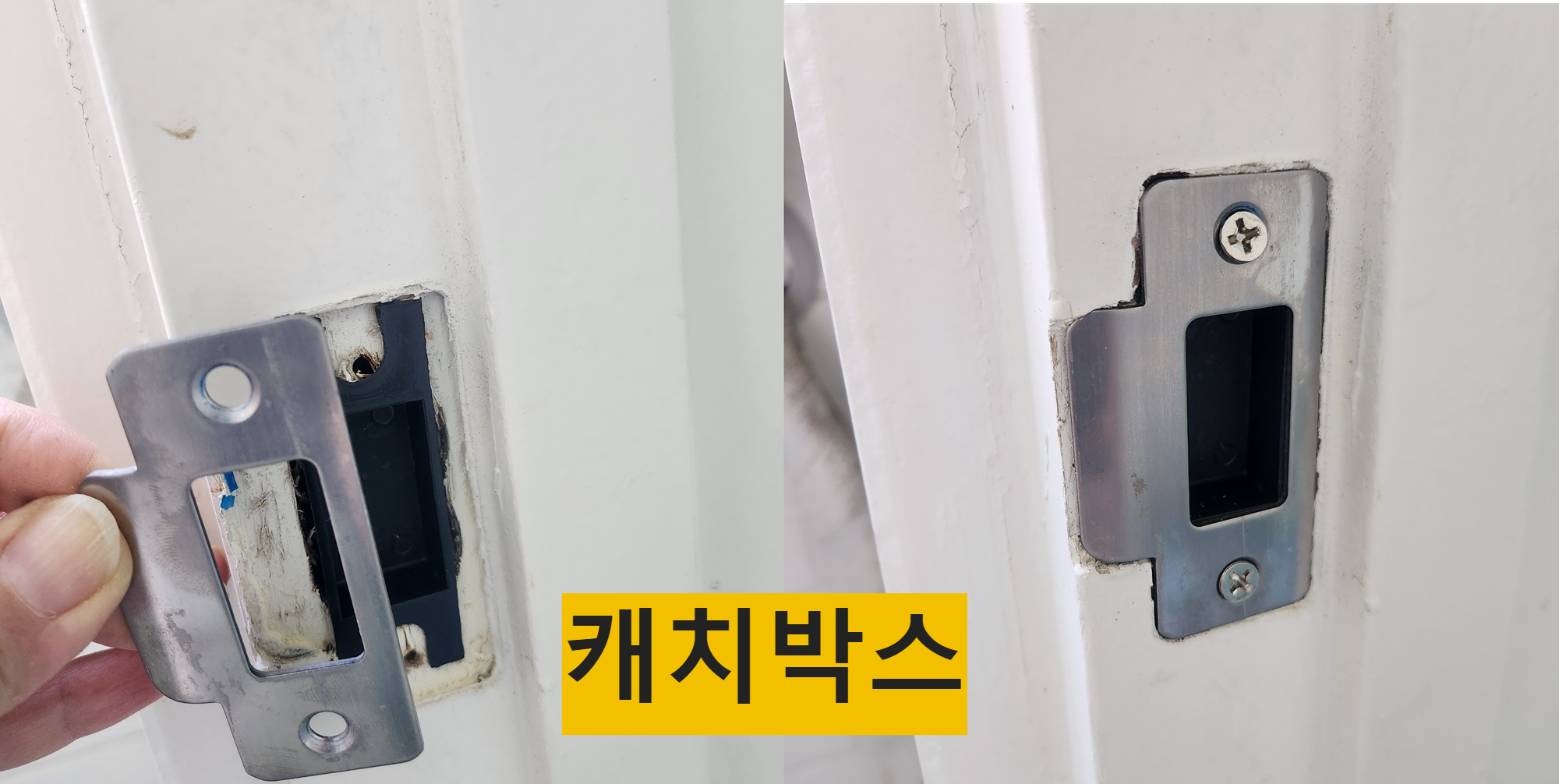 먼저 벽면 캐치박스를 교체해 줍니다. 여기서 조심해야 할 점이 있는데요. 저희 집처럼 나무로 된 벽면은 오래됐을 경우 쉽게 부서지는 경우도 있으니 나사를 풀 때 전동 드라이버 대신 수동 드라이버를 사용하는 것을 권해드립니다. 전동 드라이버를 사용하다가 힘이 많이 들어갈 경우 나사를 잡고 있던 나무가 부서질 수 있거든요.