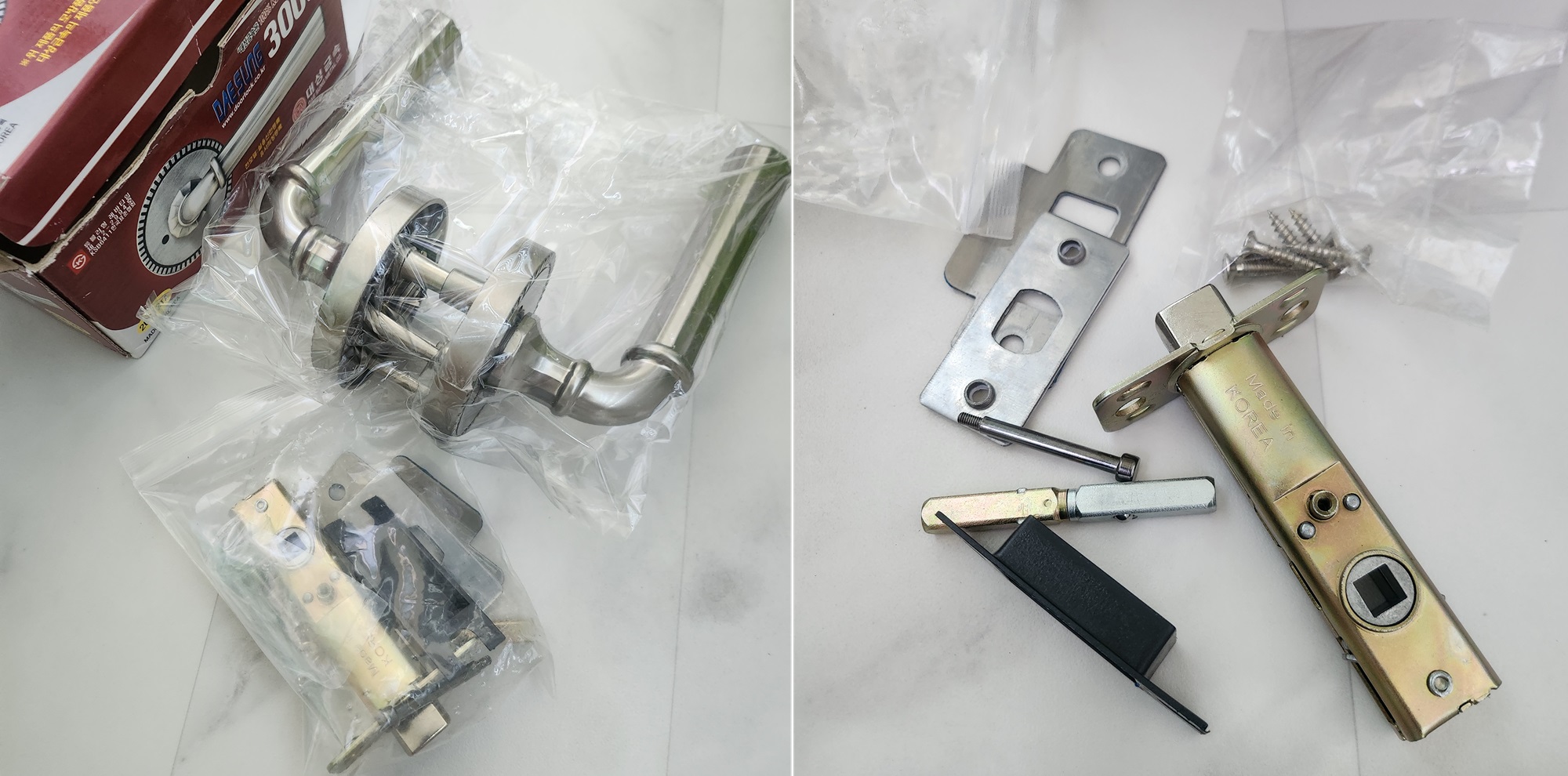 문 손잡이는 가까운 철물점이나 인터넷 쇼핑몰에서 구매하면 되는데요. 구매할 때 주의할 점이 있습니다. 기존에 달려 있는 손잡이의 크기와 비슷한 것을 구매하는 게 가장 좋은데요. 잘못 사면 문에 뚫려있는 구멍과 안 맞을 수 있기 때문입니다. 그리고 잠금장치가 열쇠인지 눌러서 열 수 있는 핀형인지 구분해서 구매를 하셔야 합니다.