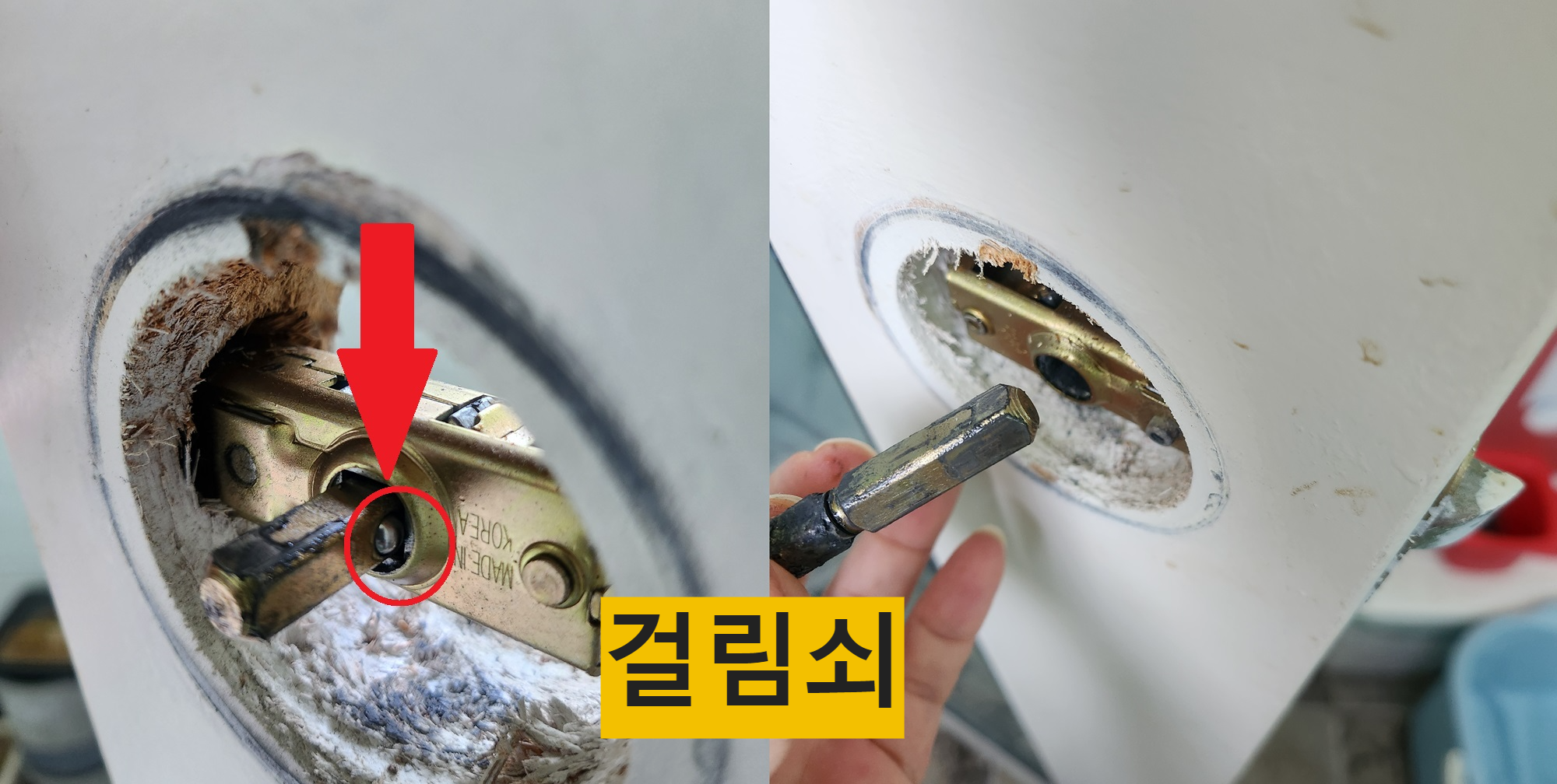 그렇게 문 옆의 래치 고정판을 나사로 고정해 주고 걸림쇠를 끼워주는데요. 끼울 때로 뺄 때와 같이 고정볼을 눌러서 끼워줍니다.