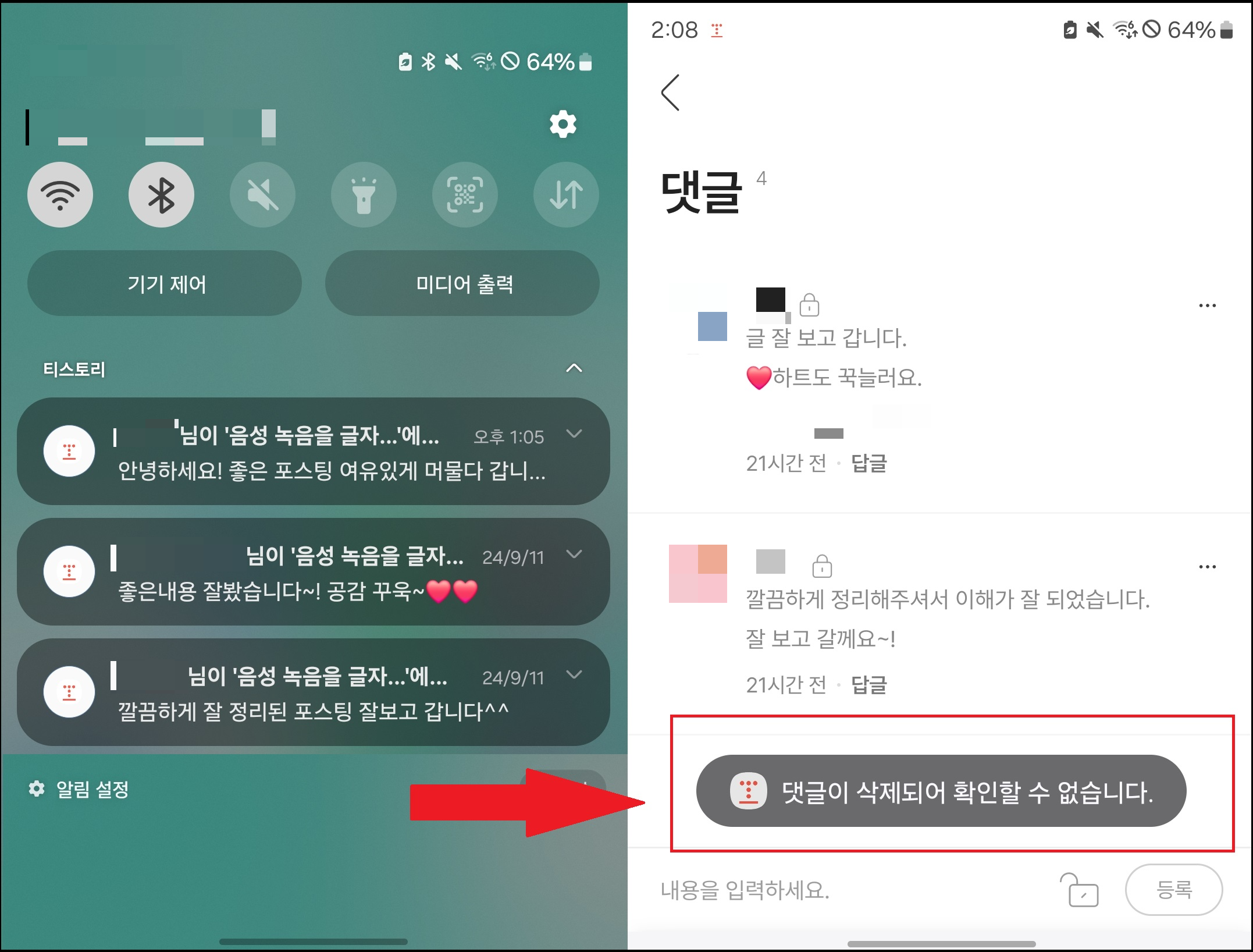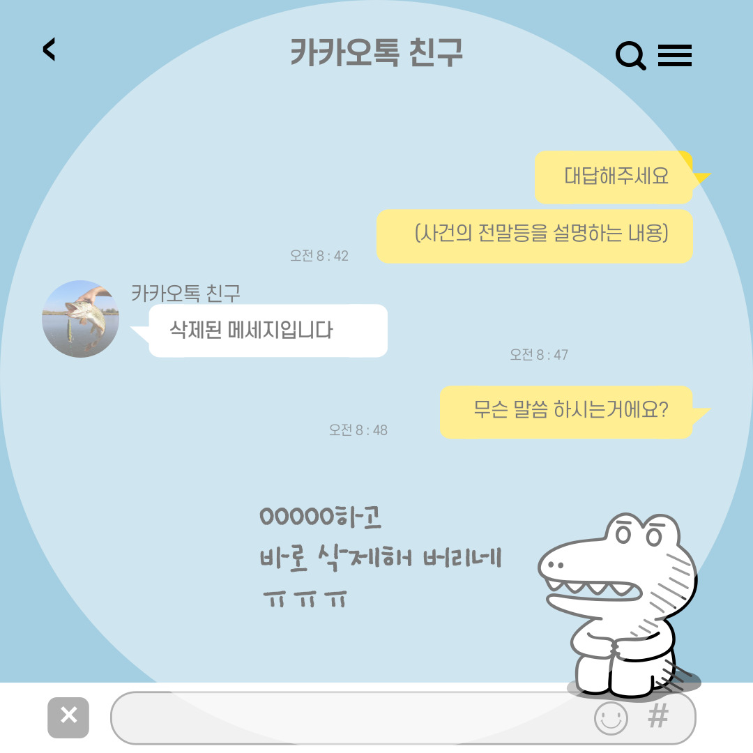하지만 그 알림을 클릭하고 접속했을 때 '댓글이 삭제되어 확인할 수 없습니다.' 혹은 카카오톡의 경우 '삭제된 메세지입니다.'라고 뜰 때가 있는데요. 메세지를 보내거나 댓글을 남긴 상대방이 삭제해 버린 것입니다.