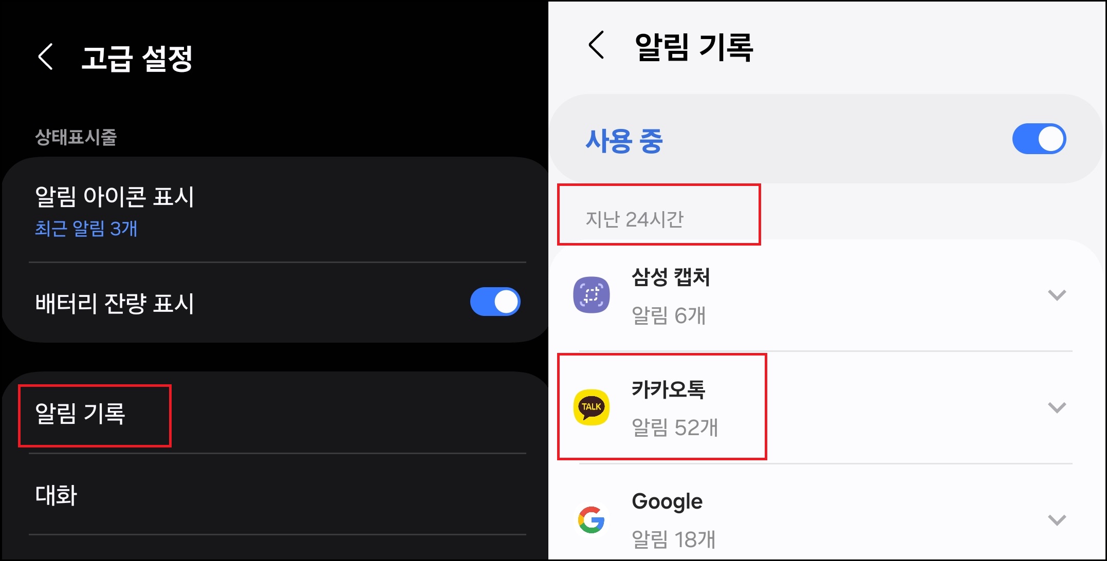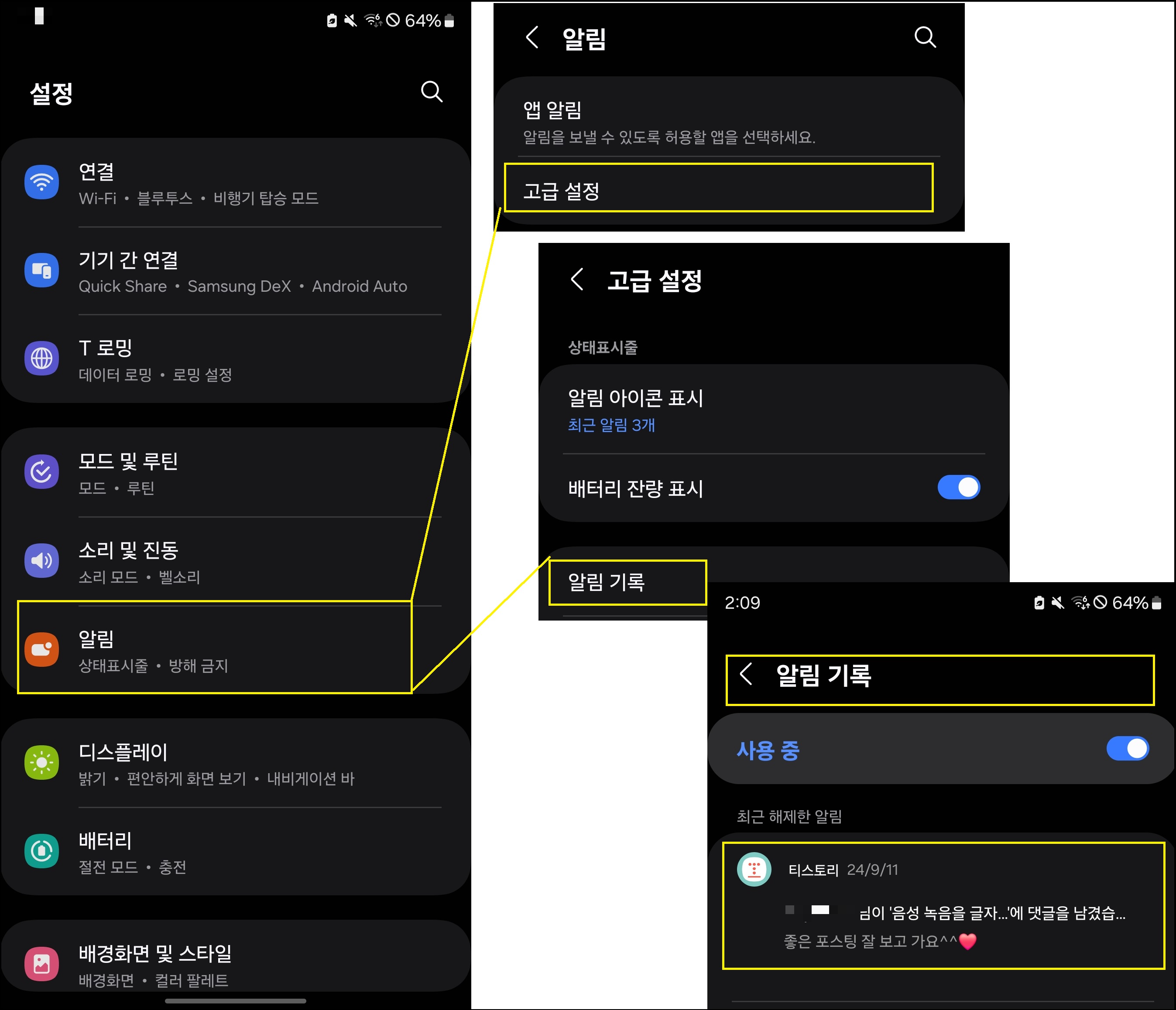 설정 → 알림 → 고급설정 → 알림 기록