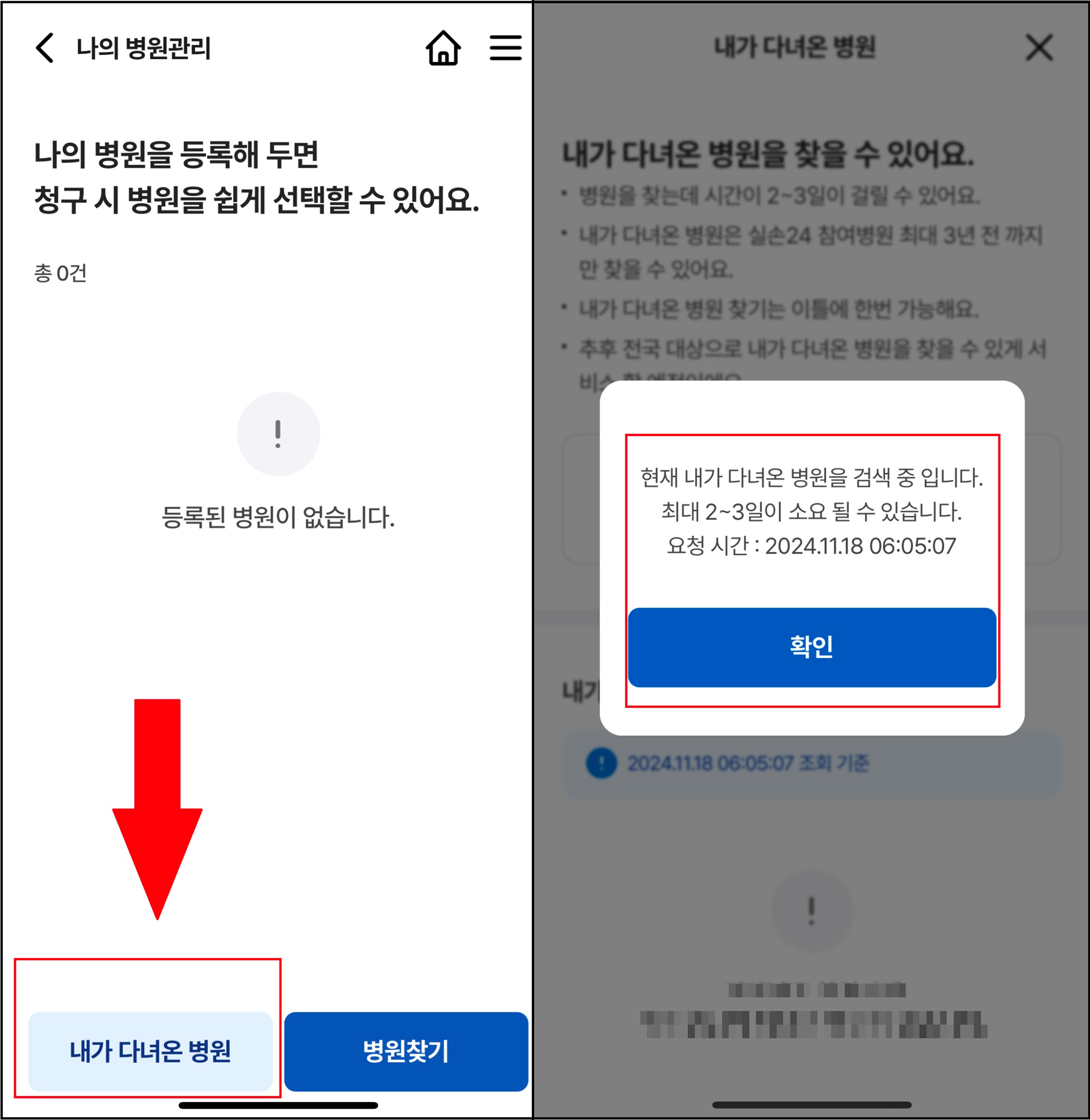 병원을 찾는 데 걸리는 시간이 최소 하루에서 최대 2~3일 정도 걸릴 수 있으니 실손 24 앱을 설치하면서 홈화면에 있는 내가 다녀온 병원 찾기(나의 병원 관리)를 통해 나의 병원을 등록해 두면 실손 청구 시 병원을 쉽게 선택할 수 있습니다.