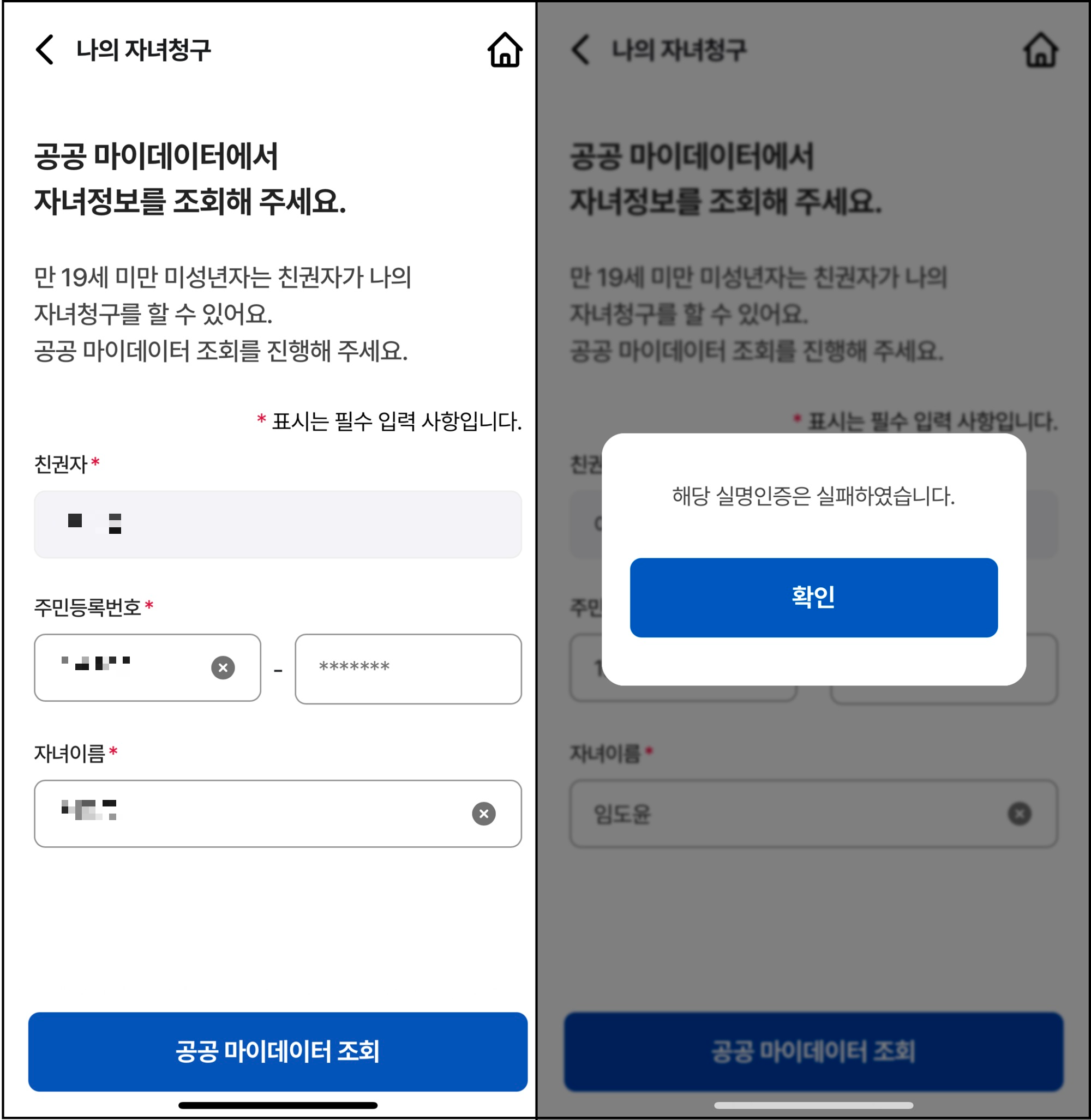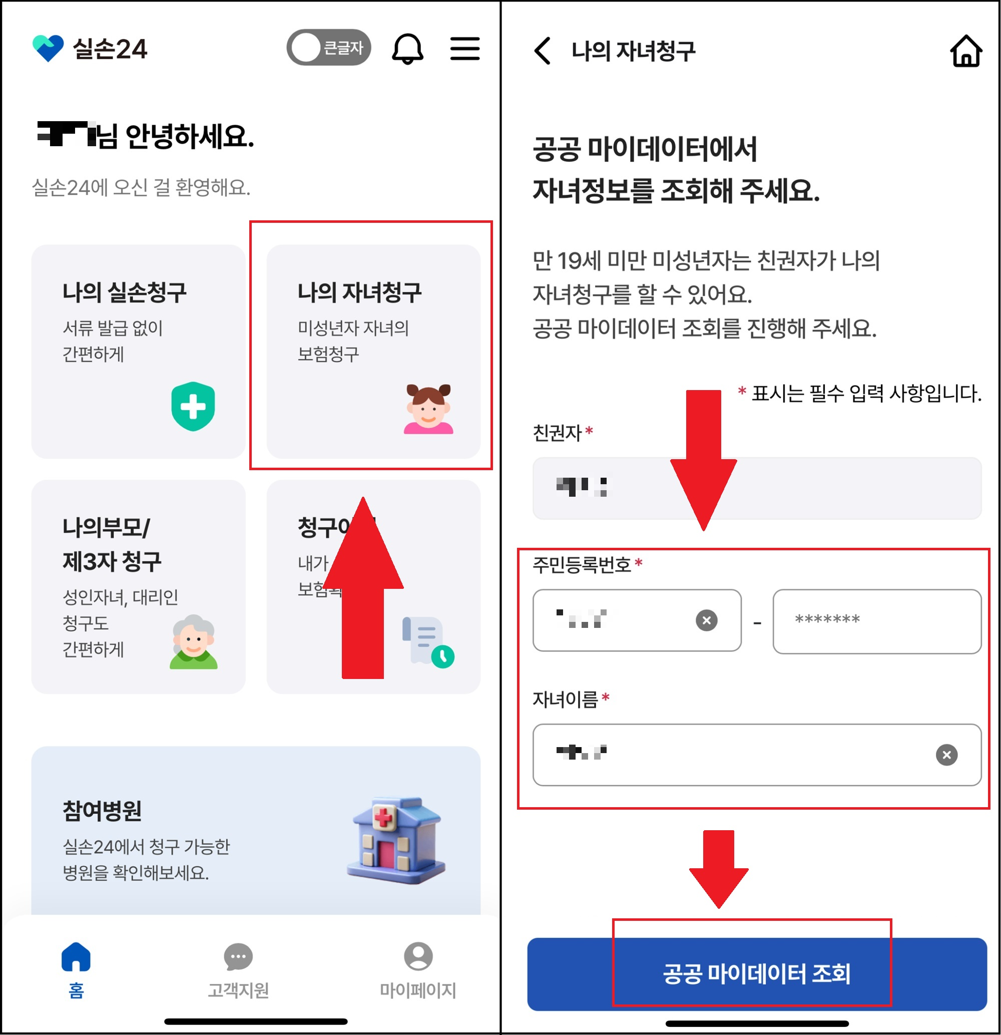 내 자녀는 실손 24에서 등록하는 것이 아닌 공공 마이데이터 조회로 찾을 수 있습니다.