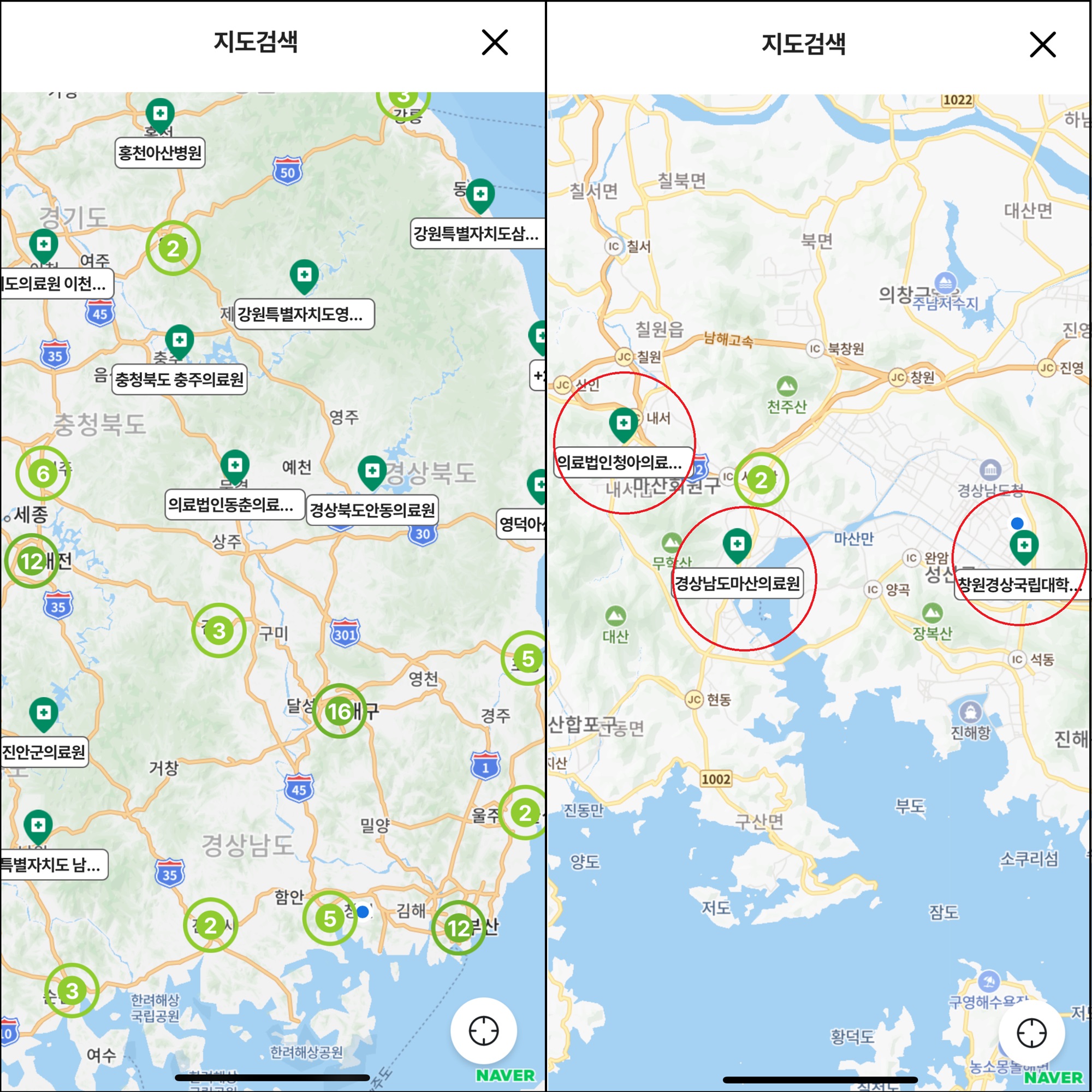 참여병원 검색은 병원 이름으로 검색할 수 있지만 지도 검색으로 지역 검색이 가능합니다.