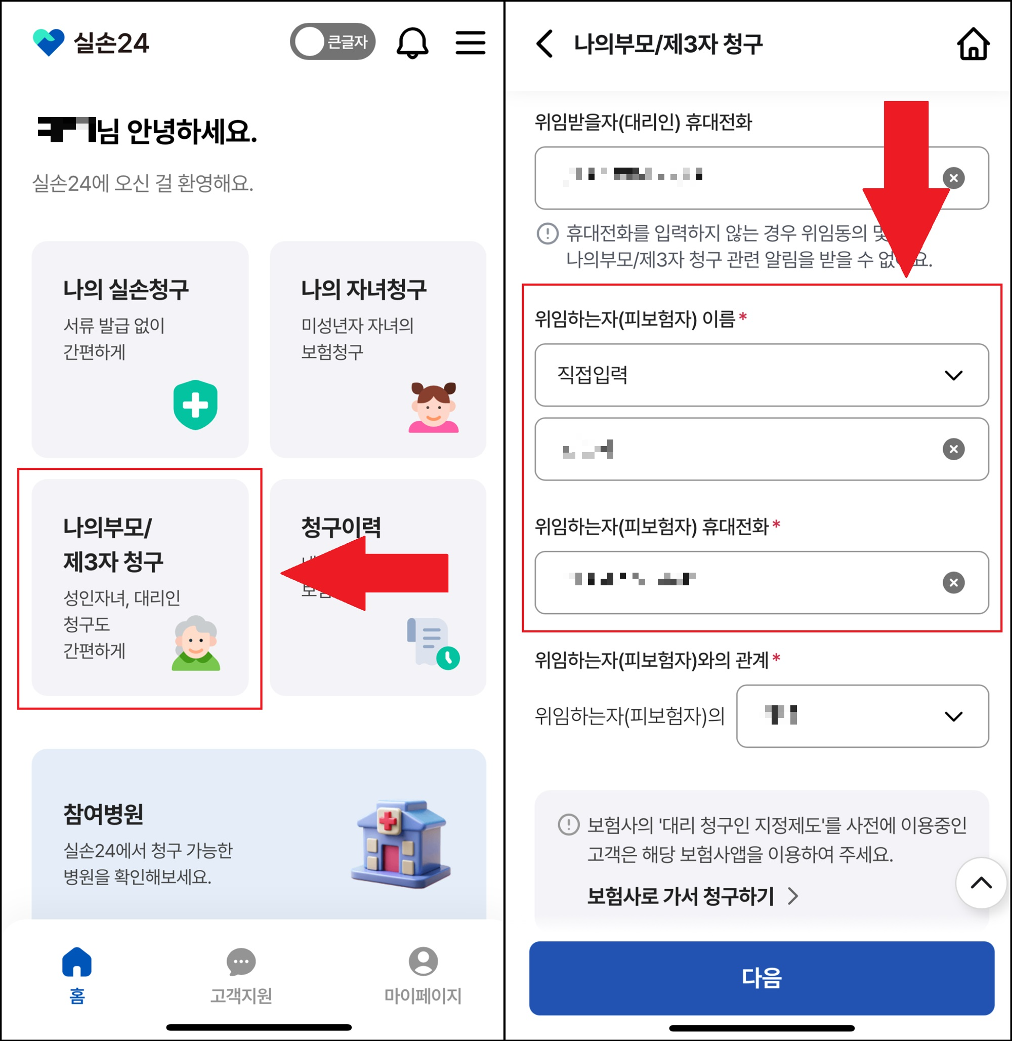 마지막으로 실손 24의 편리한 부분인 나의 부모/제 3자 청구입니다.