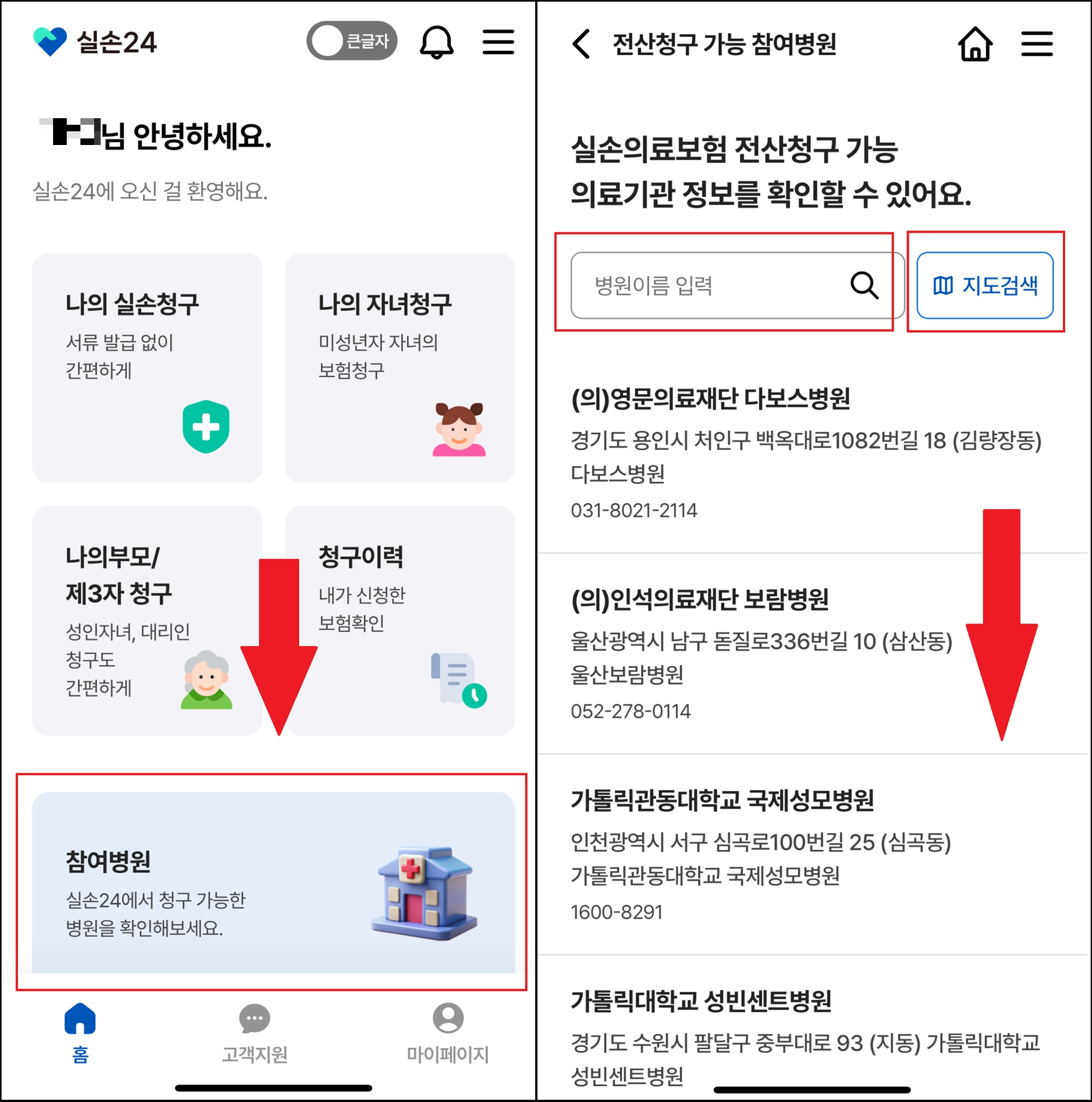 실손 24에서 청구 가능한 참여병원을 검색할 수 있고 내가 다녀온 병원도 검색할 수 있습니다.