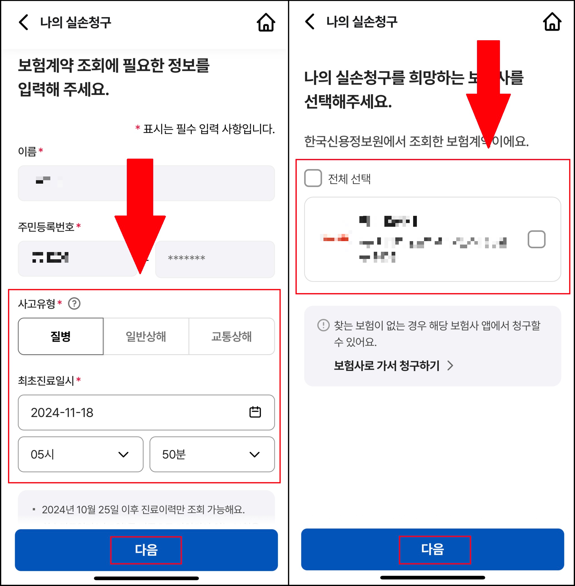 ▶ 실손 24 앱에서 청구 가능한 진료기록 조회는 최초 진료일 기준 3년 이내이지만 실손 24 시스템이 오픈된 2024년 10월 25일 이후 진료 이력부터 조회/청구가 가능합니다.