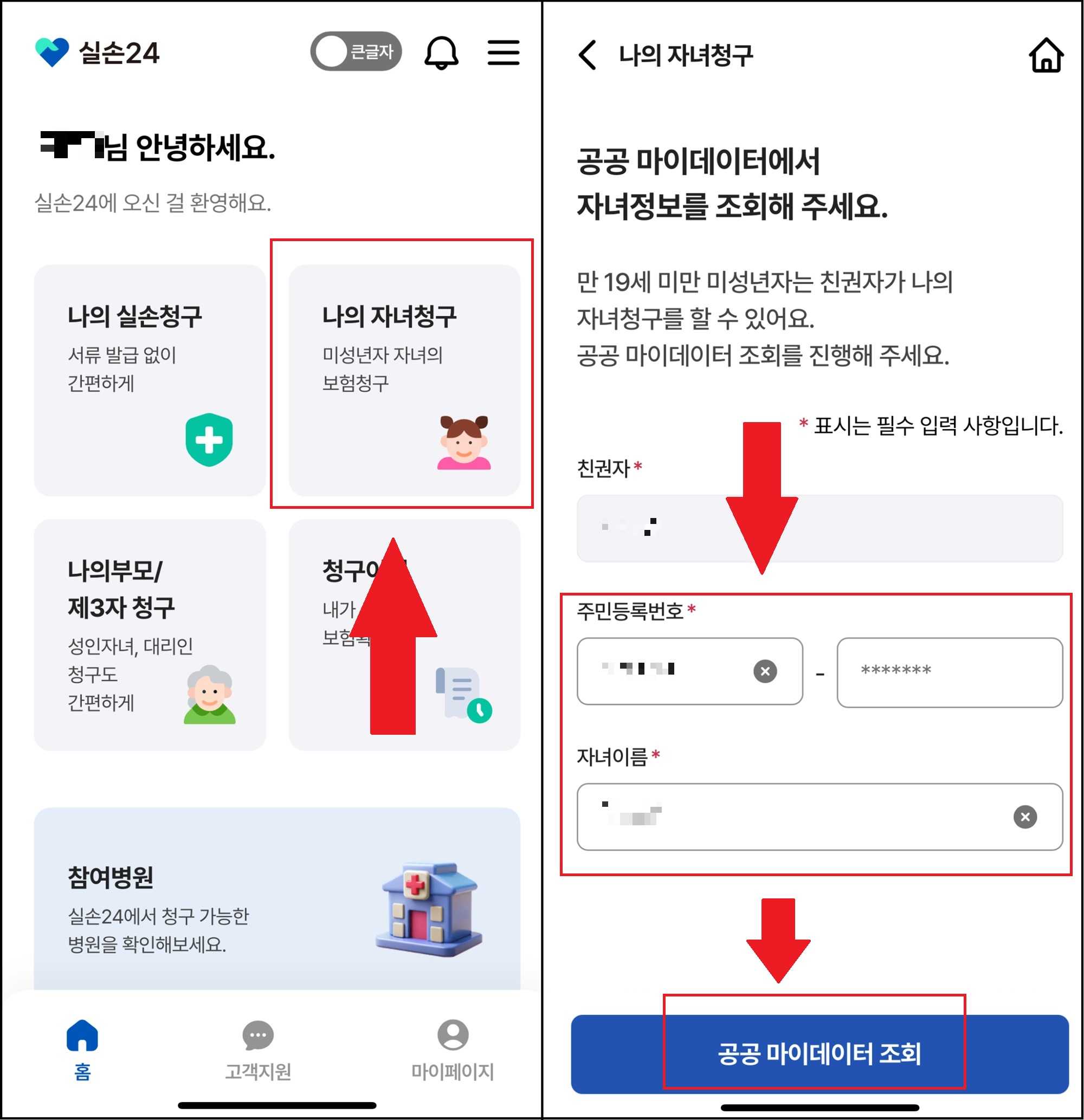 2. 실손 24 나의 자녀 청구하기