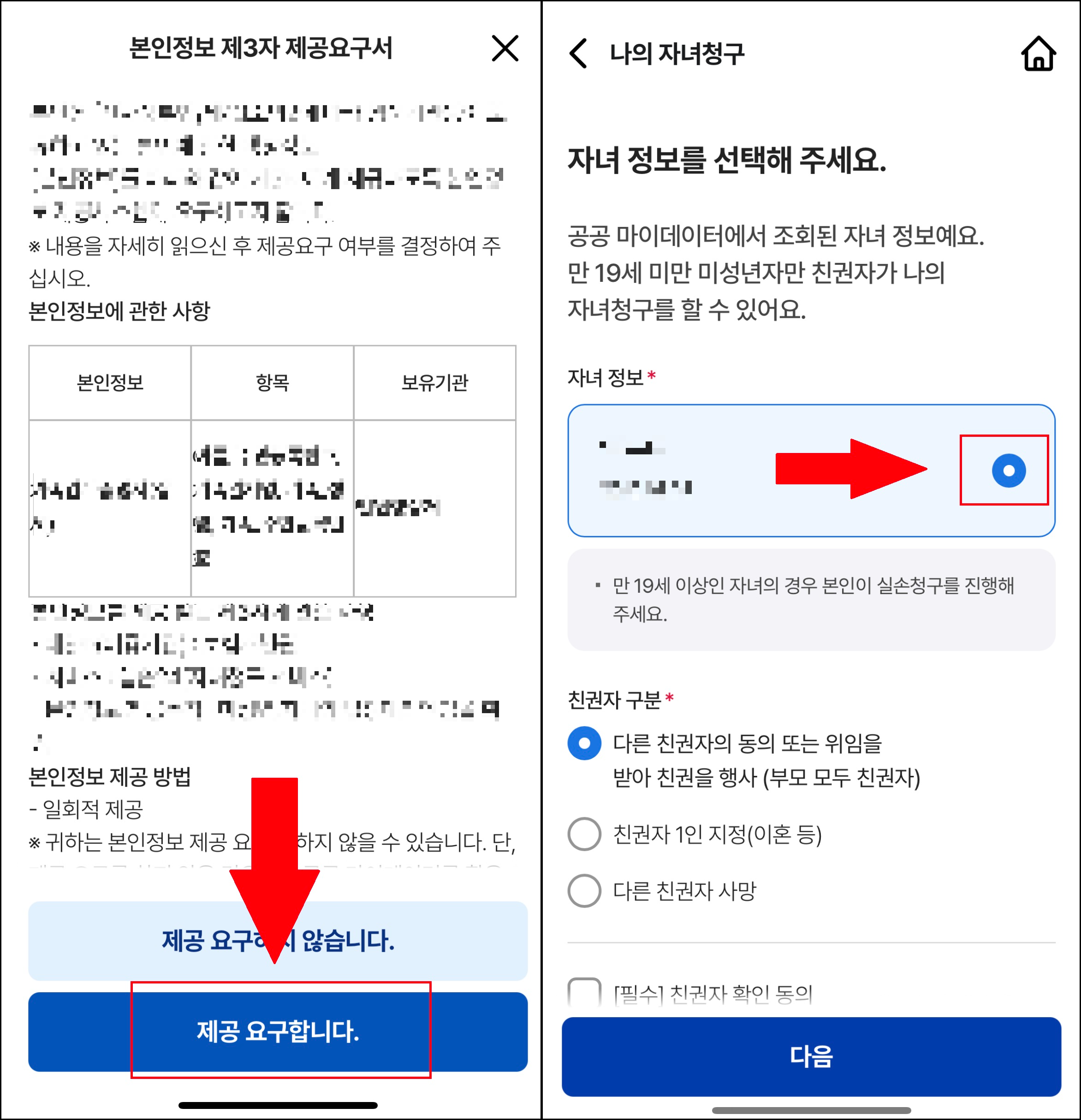 앞서 공공 마이데이터에 회원가입이 되어 있다면, 본인정보 제 3자 제공요구서를 클릭하고 나면 자녀의 정보가 나타납니다. 친권자 확인 동의를 하고 다음을 클릭하면 나의 실손 청구와 같이 청구를 진행할 수 있습니다.