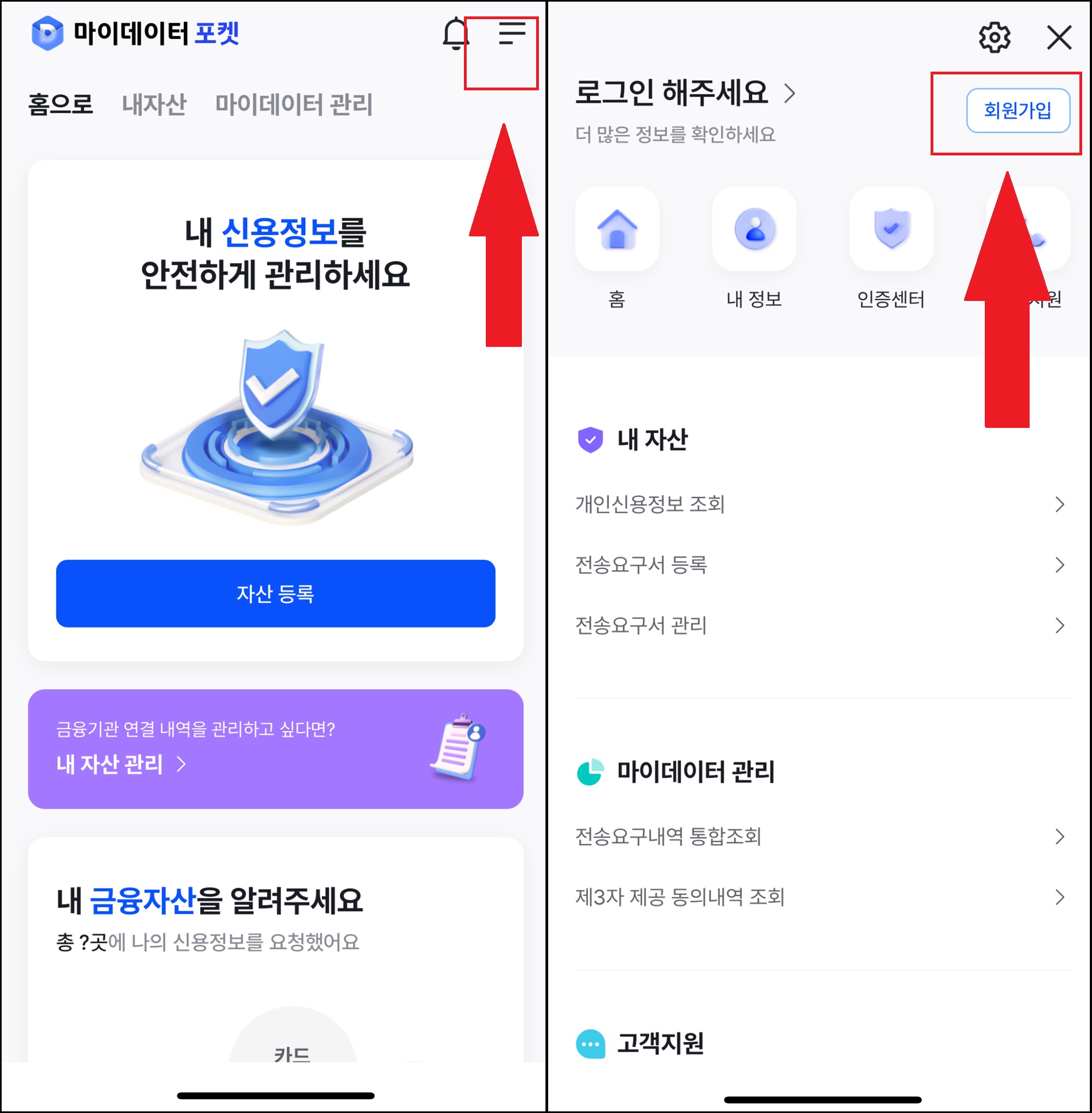 마이데이터 포켓 홈화면에서 오른쪽 상단에 있는 삼선을 클릭해서 회원가입을 진행할 수 있습니다.