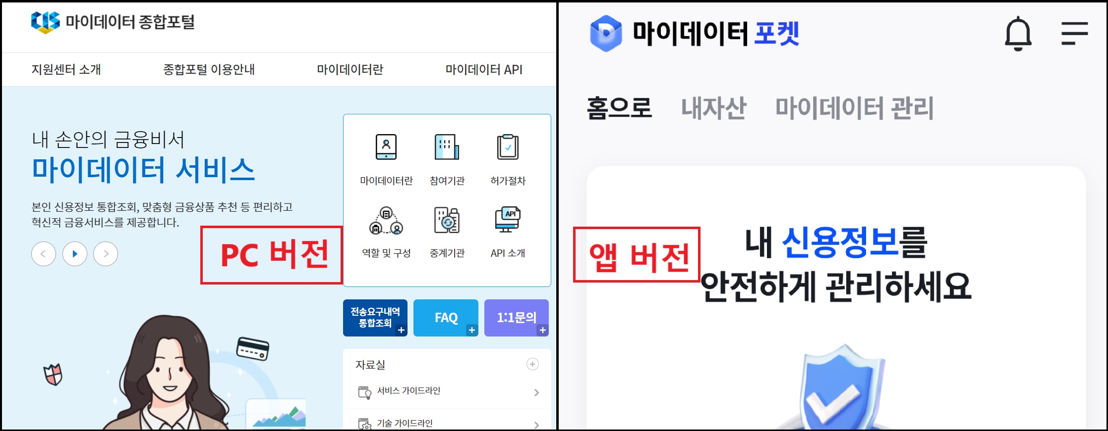 공공 마이데이터는 [마이데이터 종합포털]이라는 PC 버전과 [마이데이터 포켓]이라는 휴대폰 앱 버전이 있습니다.