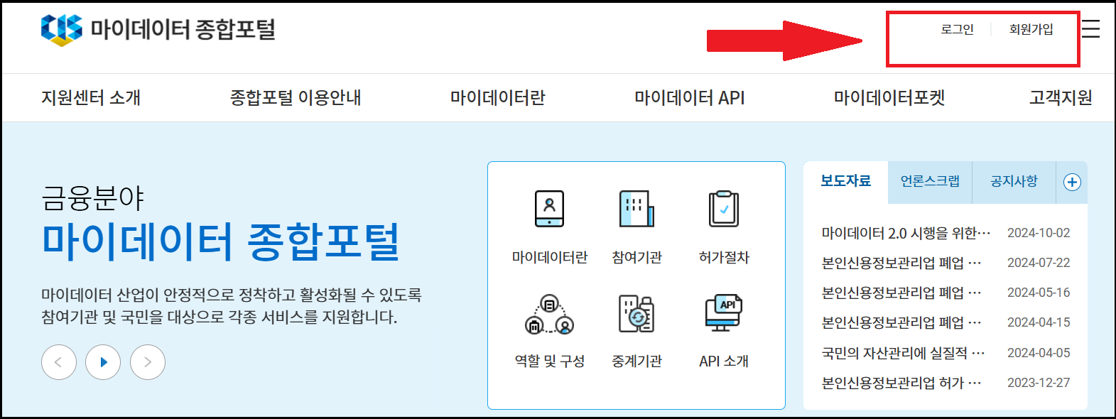 PC에서는 마이데이터 종합포털 사이트에서는, 오른쪽 상단에 있는 회원가입으로 진행할 수 있습니다.