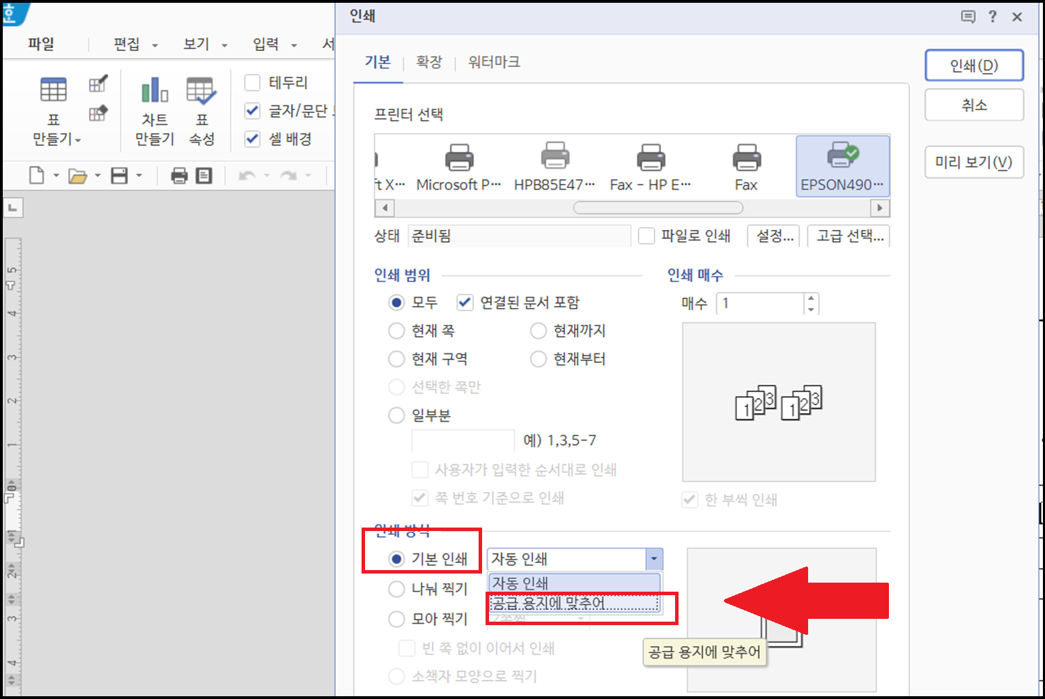 위 이미지에 나와 있듯이 인쇄 방식을 '자동 인쇄'가 아닌 '공급용지에 맞추어'로 변경해 주는 것입니다.