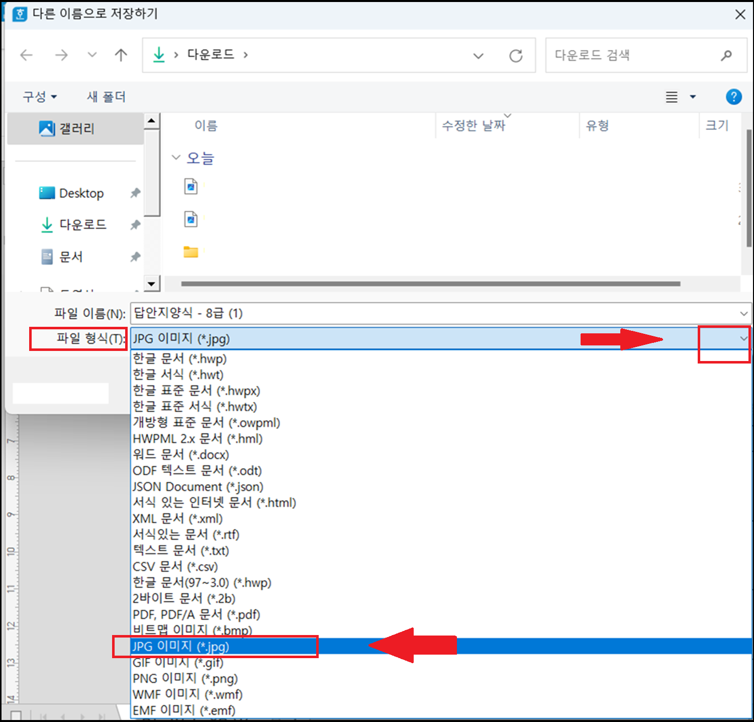 이때 파일 형식 줄의 오른쪽에 위치한 방향키를 클릭합니다.