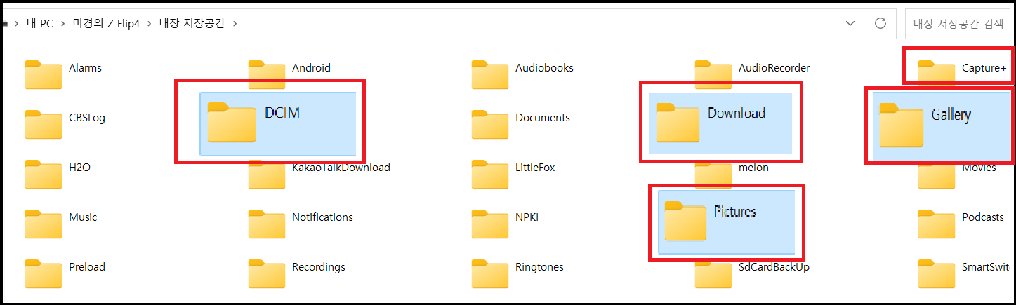 내 스마트폰을 클릭하면 여러 가지의 파일들이 나옵니다. 그중 사진이 들어 있는 파일은 DCIM 파일인데 주로 카메라로 촬영한 사진들이 들어 있습니다. 그 외에는 Gallery, Pictures, Capture, Download 파일에 사진이나 문서파일 등이 저장되어 있습니다.