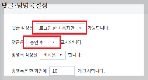 댓글*방명록-설정에서는 댓글 작성은 [로그인한 사용자만] 가능하게 하고, 댓글은 [승인 후] 표시하게끔 설정해 줍니다.