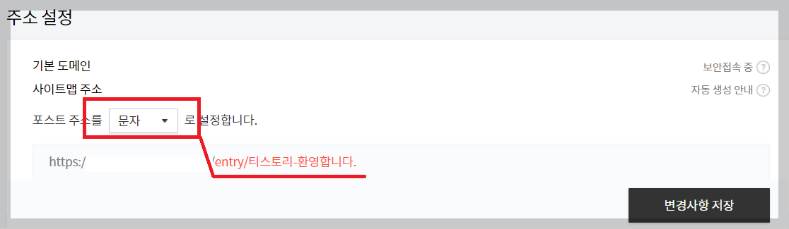 블로그-주소 설정에서는 포스트 주소를 [문자]로 설정합니다.