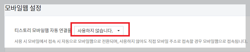 꾸미기-모바일에서는 티스토리 모바일웹 자동연결을 [사용하지 않습니다]로 저장합니다.