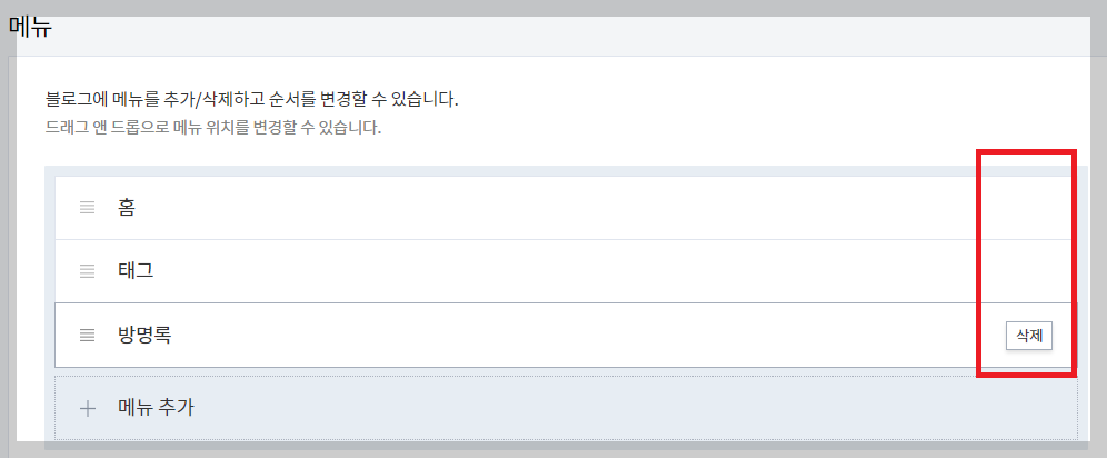 꾸미기-메뉴에서는 메인화면에 나오는 상단 목록을 추가나 삭제를 할 수 있고 순서도 변경할 수 있습니다.
