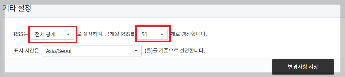 블로그-기타 설정에서는 rss를 설정해 주는데, rss는 블로그의 최신 글을 구글이나 다음에 빠르게 업데이트해 주는 기능이기 때문에 [전체공개]로 설정하고, 공개될 rss 개수는 50개로 변경해 줍니다.