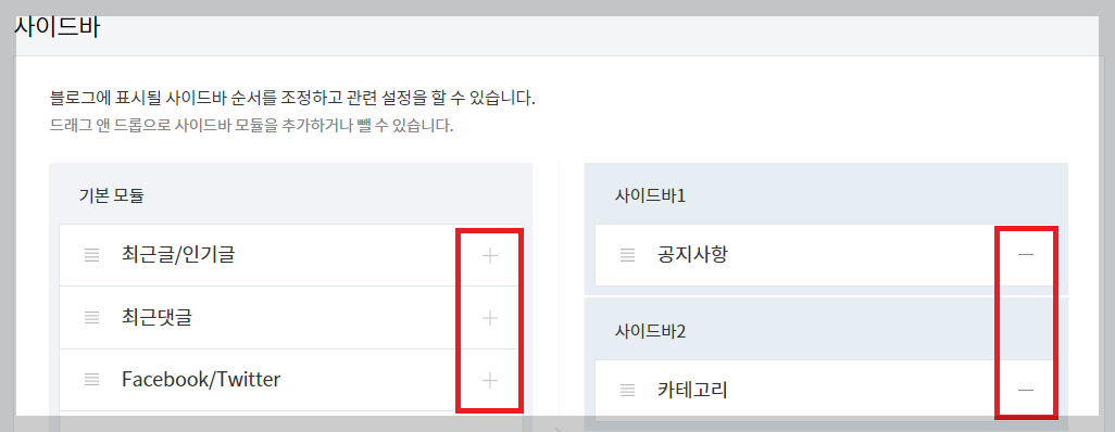 꾸미기-사이드바에서는 더하기나 빼기를 사용해서 목록을 만들 수 있지만 승인 전에는 모두 빼는 것이 좋고,