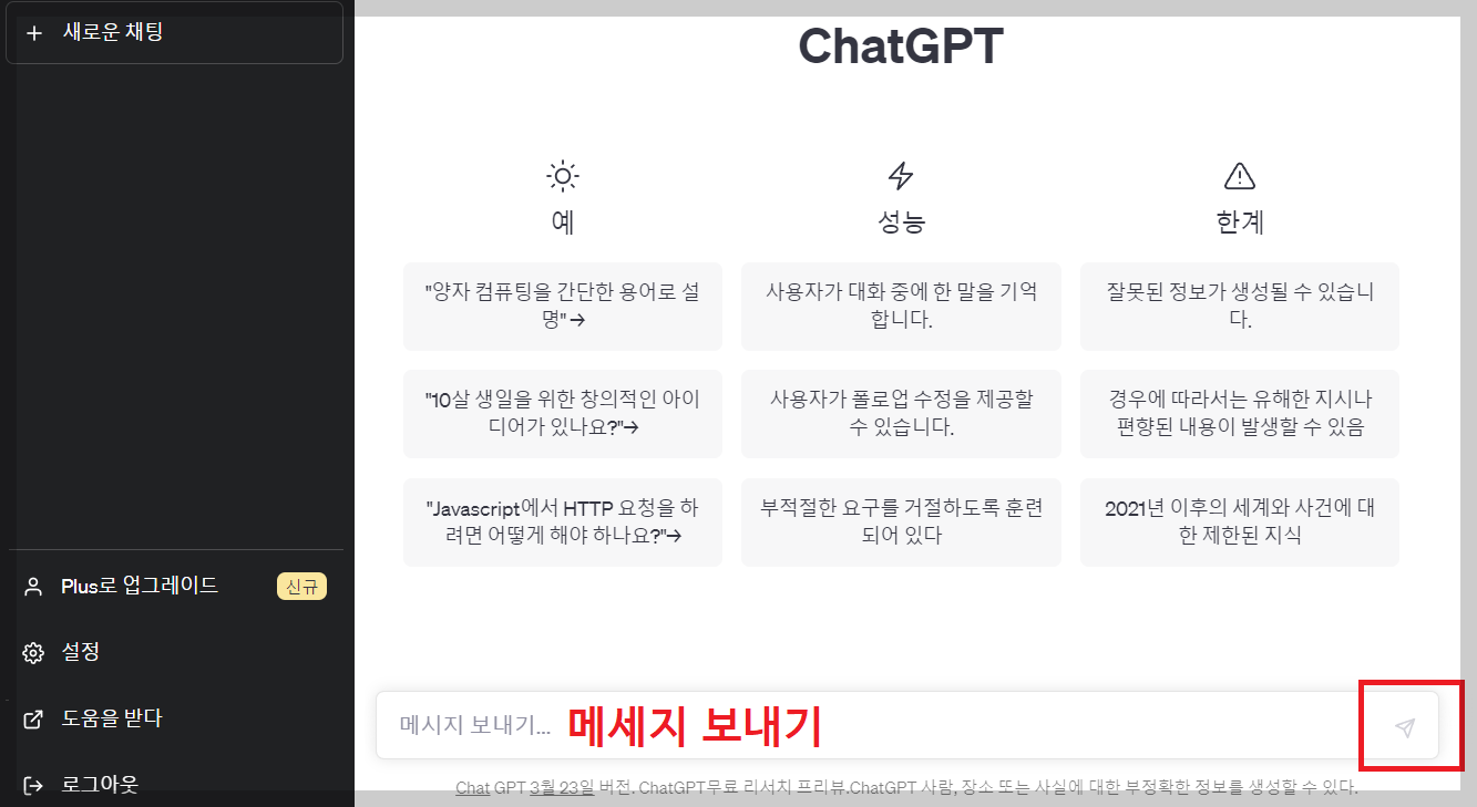 채팅화면에서 메세지 보내기 창에 질문을 입력하고 오른쪽 비행기 아이콘(전송)을 누르면 대화가 진행됩니다.