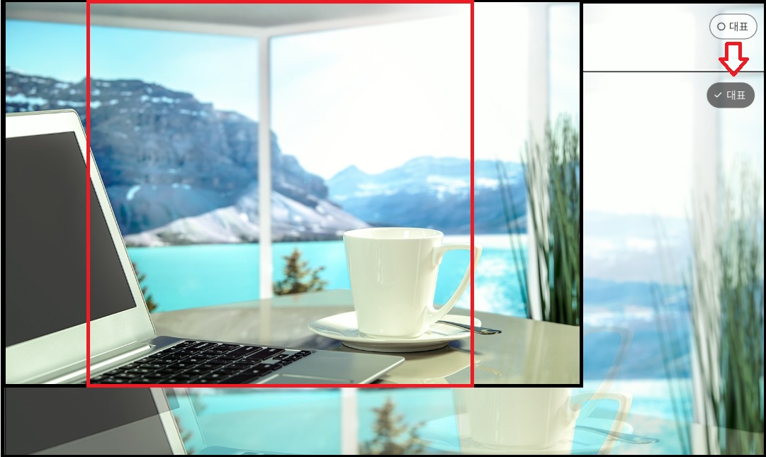 위 사진에서 보이는 것과 같이 이미지를 클릭하면 '대표'라는 글자가 나오는데 이것을 눌러서 대표 사진으로 보이게 합니다. 그러면 썸네일에는 사진 속 빨간 테두리 안의 이미지만 보이게 되는 것입니다.
