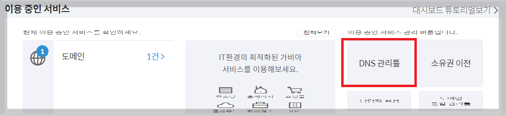 도메인 1건이라고 표시되어 있는 것을 확인하고 그 옆에 옵션에서 DMS 관리툴로 들어 갑니다.