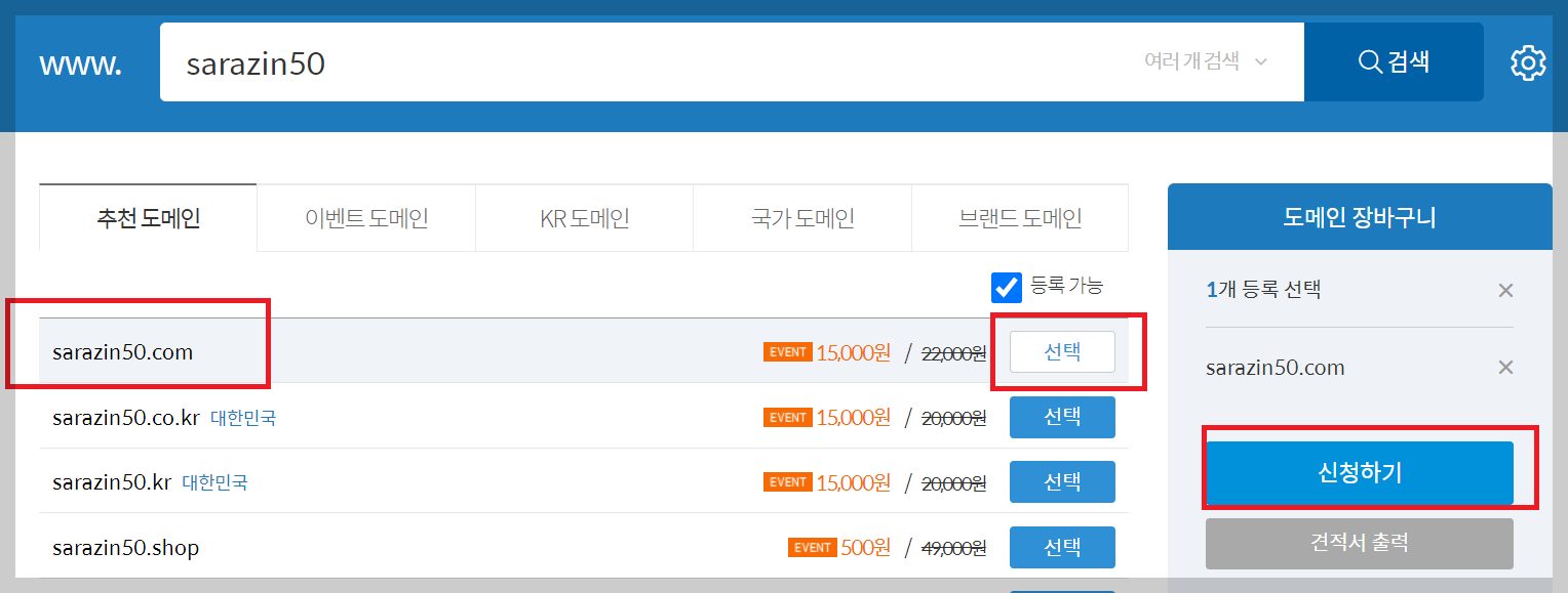 여러 가지를 해보고 닷컴(.com)이 붙는 주소가 나오면 그것으로 선택을 해 줍니다. 닷컴을 하는 이유는 구글이 닷컴으로 된 주소를 선호한다고 합니다. 그리고 신청하기를 눌러 줍니다.