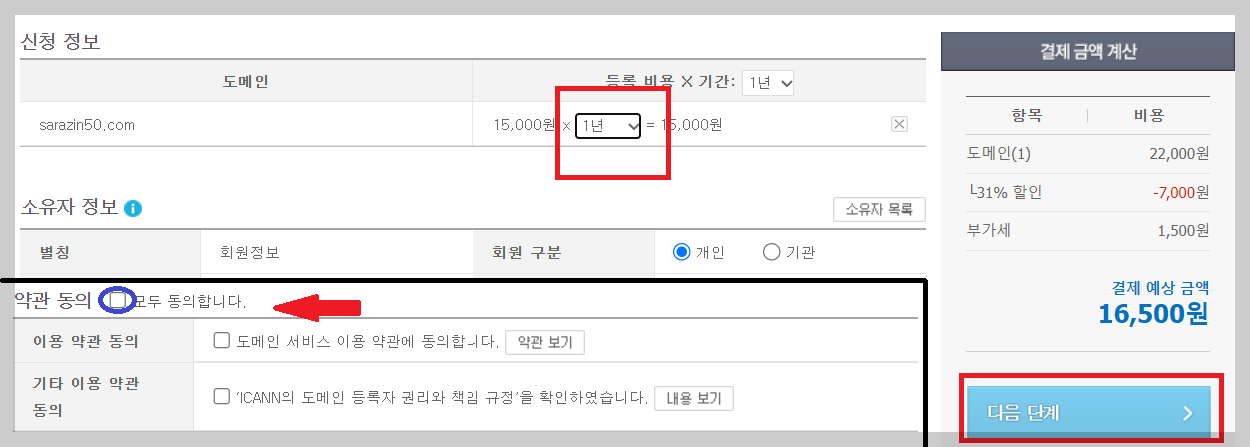 신청정보에 기간을 설정하는데 우선 1년으로 사용을 합니다. 기간연장은 메일이 온다고 하니 그때 가서 연장을 할지 안 할지 결정해도 됩니다. 기간신청과 개인정보만 입력하고 화면 아래 약관동의에만 체크합니다. 그리고 다음 단계를 누르고 결제를 진행합니다.