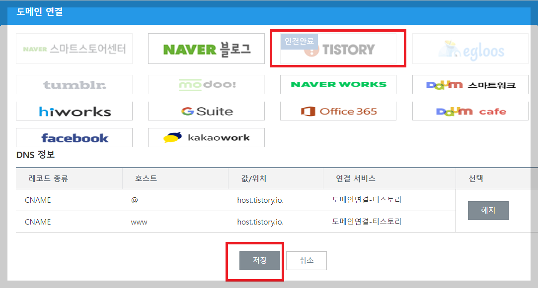 여러 개의 사이트가 뜨는데 여기서 티스토리를 누르고 DMS 정보를 확인한 다음 저장을 눌러 줍니다.