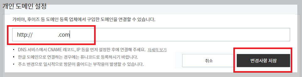 도메인 연결하기를 누르면 입력창이 나오는데 좀 전에 구매한 도메인을 입력하고 변경사항 저장을 눌러 줍니다.