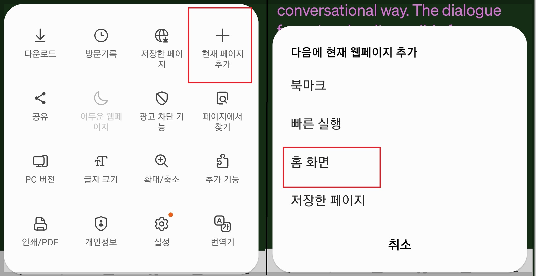 목록을 열어서 여러가지 옵션 중 현재 페이지 추가를 눌러 줍니다. 다음 화면에 나오는 옵션 중 홈 화면을 눌러 줍니다.