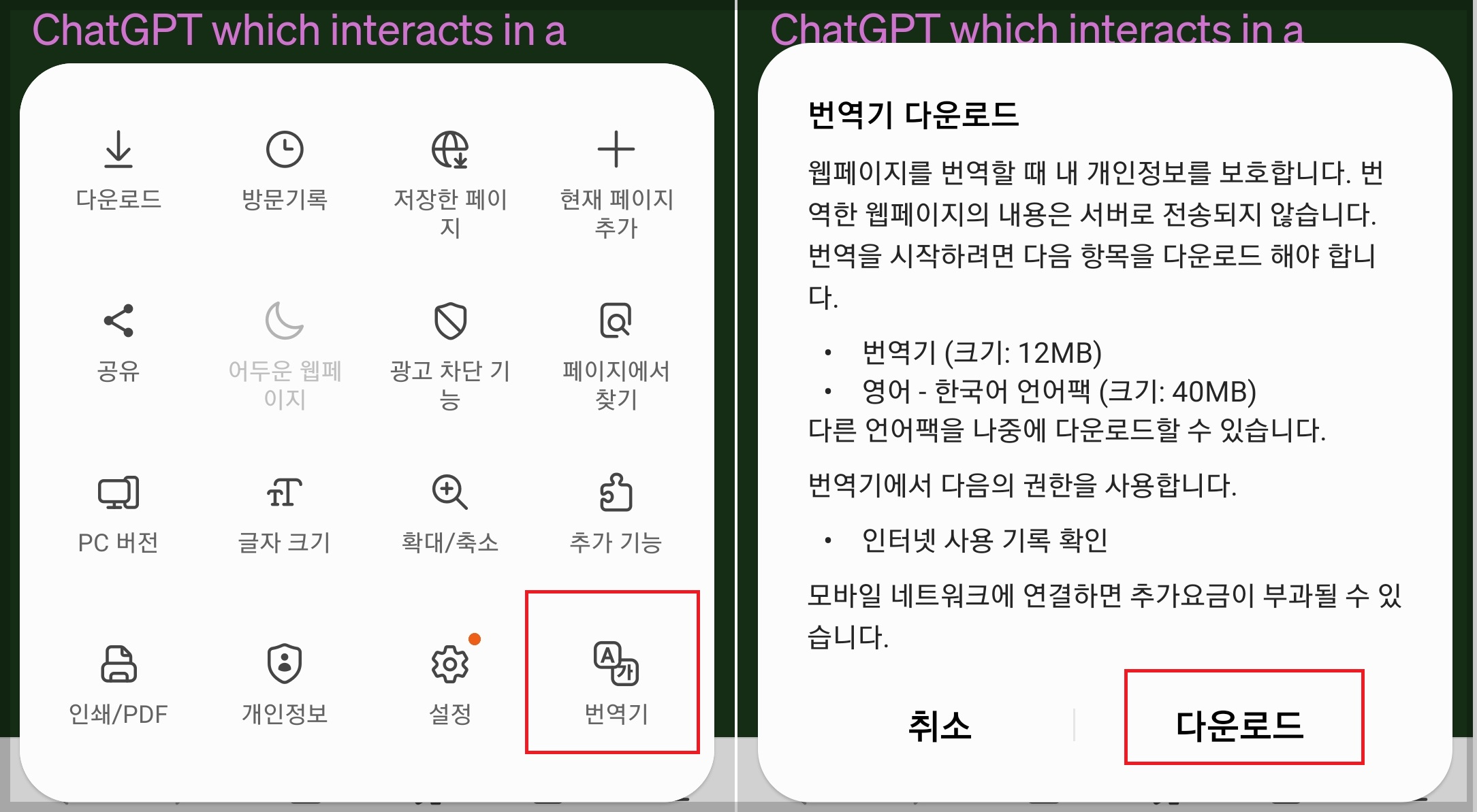 화면 하단의 줄 3개(목록)를 눌러서 옵션을 띄웁니다. 옵션 중에 번역기를 눌러 줍니다. 번역기 다운로드를 눌러줍니다.(시간이 좀 걸림)