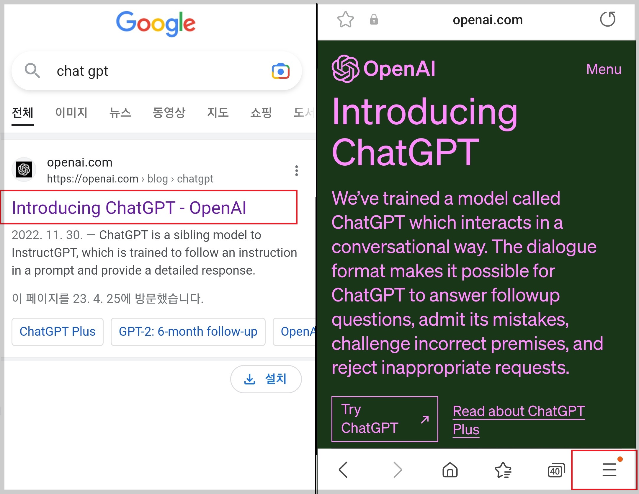 아이폰의 기능 중에 홈화면 추가 기능이 있습니다. 삼성 갤럭시에도 일반 사이트를 홈화면에 추가해서 앱처럼 사용할 수가 있는데요. chat gpt를 홈화면에 추가해서 앱처럼 사용할 수 있게 설치해 보겠습니다.