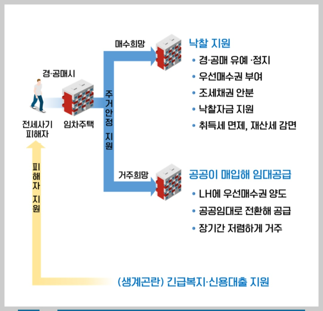 1. 피해 임차인이 직접 유예·정지 신청이 가능하며, 피해 임차인이 거주 중인 주택이 경·공매될 경우, 피해 임차인에게 최고가 낙찰액과 같은 가격으로 우선 매수할 수 있는 권한(우선 매수권)이 주어지고, 임차인이 희망 시 LH에 우선 매수권 양도도 가능하다고 합니다.