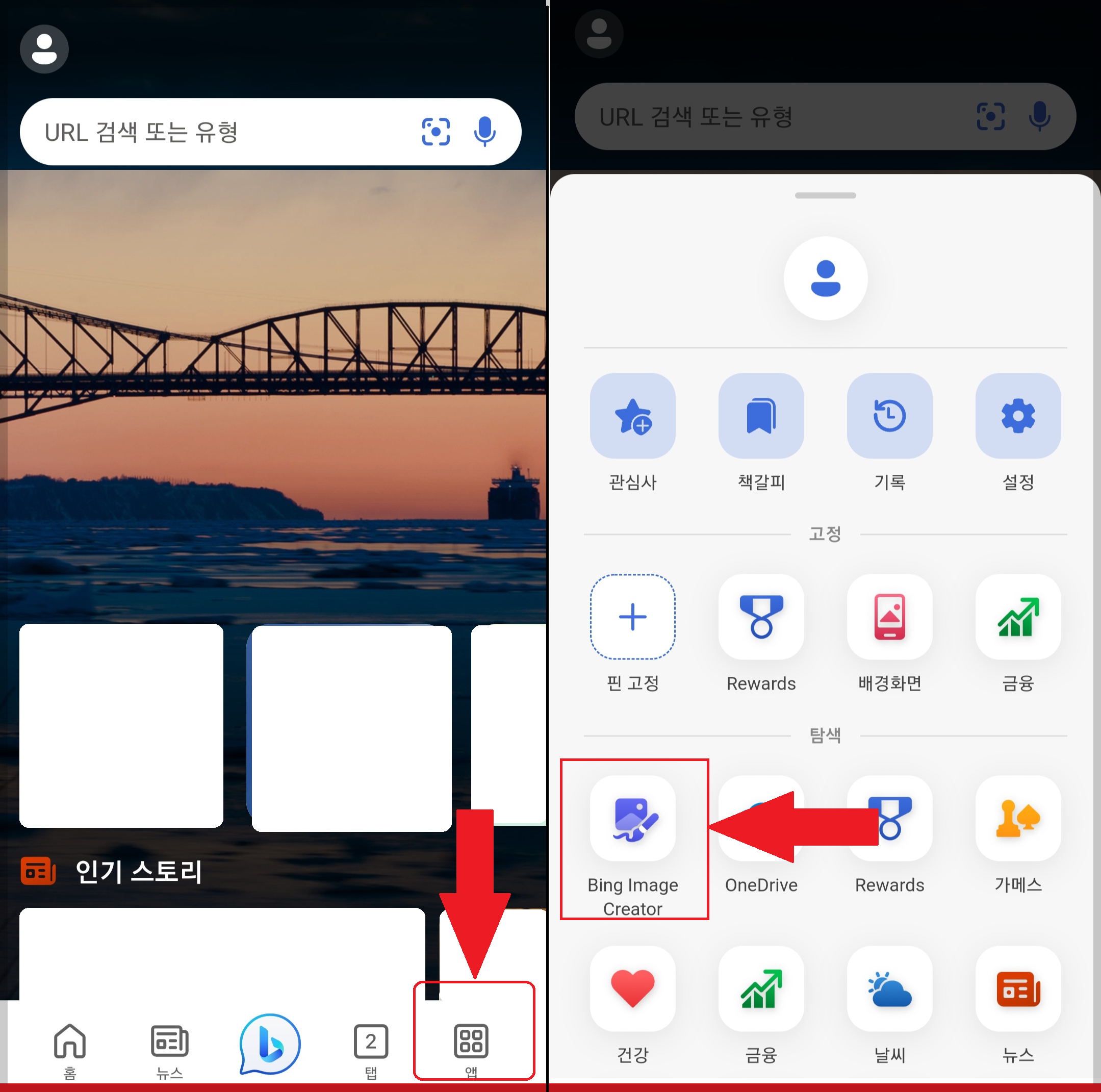 홈화면 하단에 앱이라고 되어 있는 아이콘을 누릅니다. 그럼 여러 가지 목록이 나오는데 그중 빙 이미지 크리에이터(bing image creator)를 누릅니다.