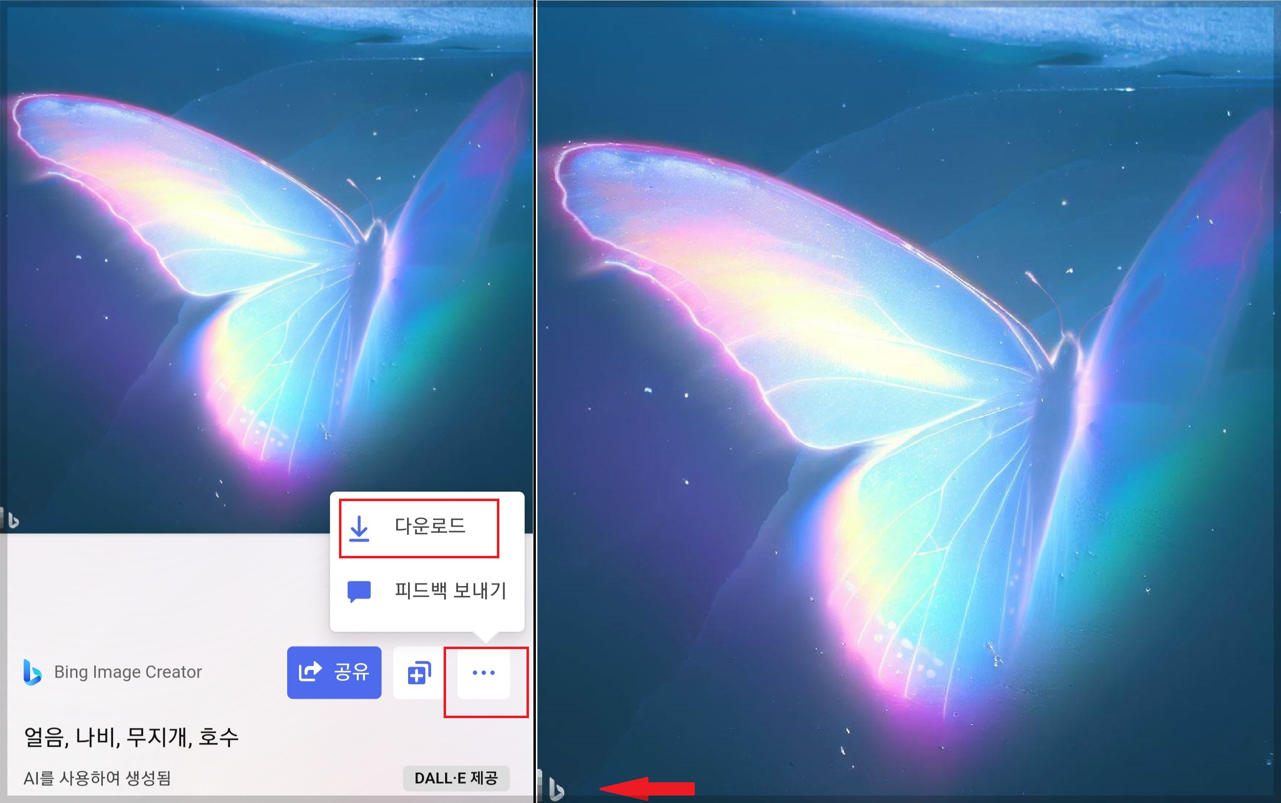 생성된 이미지 중에 마음에 들거나 사용할 이미지를 저장하기 위해서 다운로드를 합니다. 이미지를 클릭하고 이미지 아래에 있는 점 3개를 누르면 다운로드를 할 수 있습니다. 그럼 휴대폰 갤러리에 저장이 됩니다.