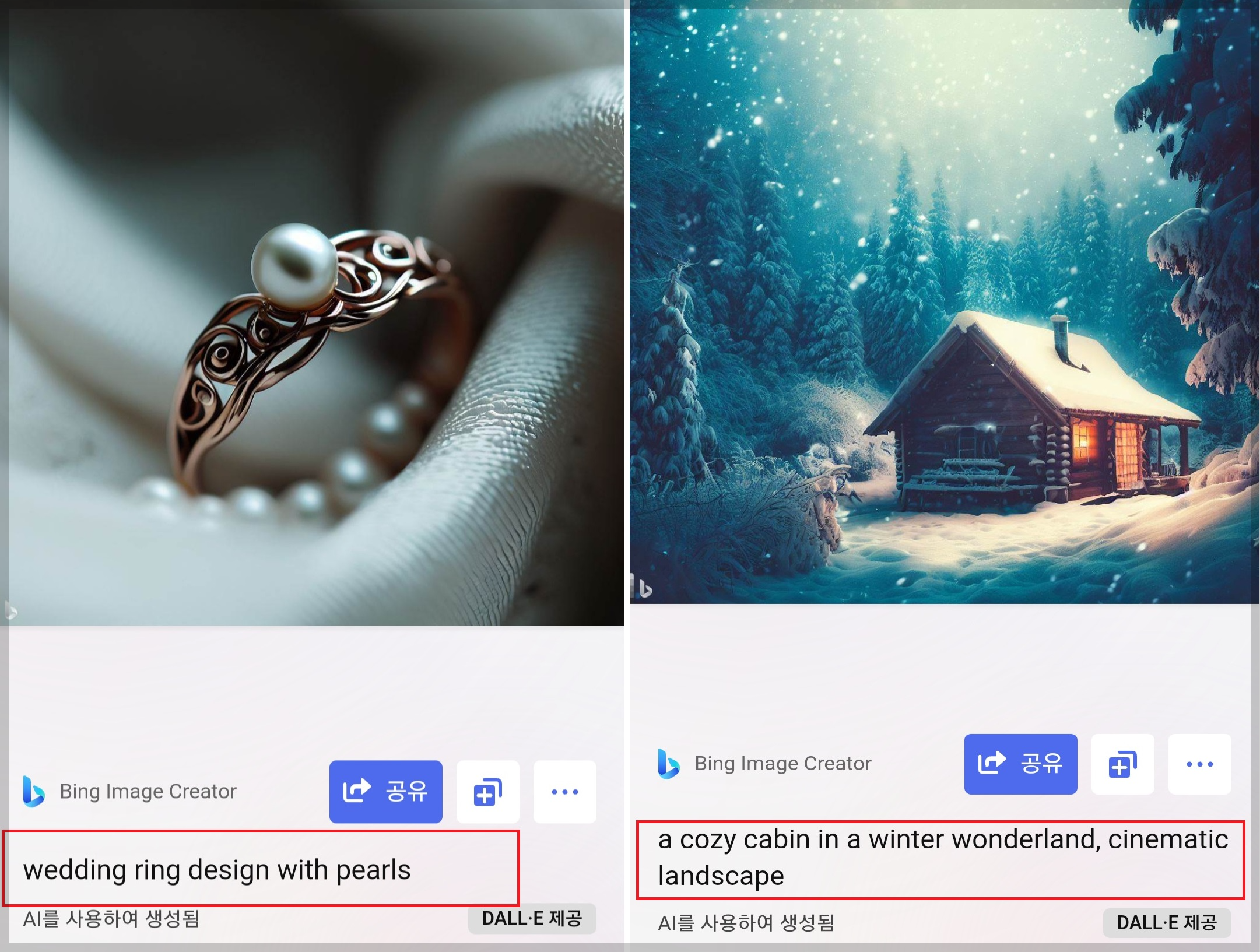 처음 사용할 때는 어떤걸 입력해야 할지 고민일 수도 있습니다. 그럴 때 참고할 수 있는 것이 이미지 크리에이터 첫 화면에서 보이는 이미지들인데요. 미리 생성되어 있는 이미지를 클릭해 보면 이미지 생성에 사용된 단어들이 나옵니다. 이것들을 참고로 단어를 사용하여 이미지를 만들어 보는 것도 좋을 거 같습니다.