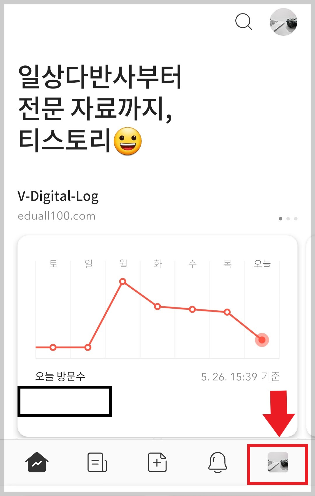먼저 스마트폰의 티스토리 앱을 열어줍니다. 그럼 오늘의 방문수가 나오는 메인 화면이 나오는데요. 여기서 오른쪽 화면 하단의 내 프로필 사진이나 프로필 사진이 없는 경우 티스토리 아이콘을 눌러 줍니다.