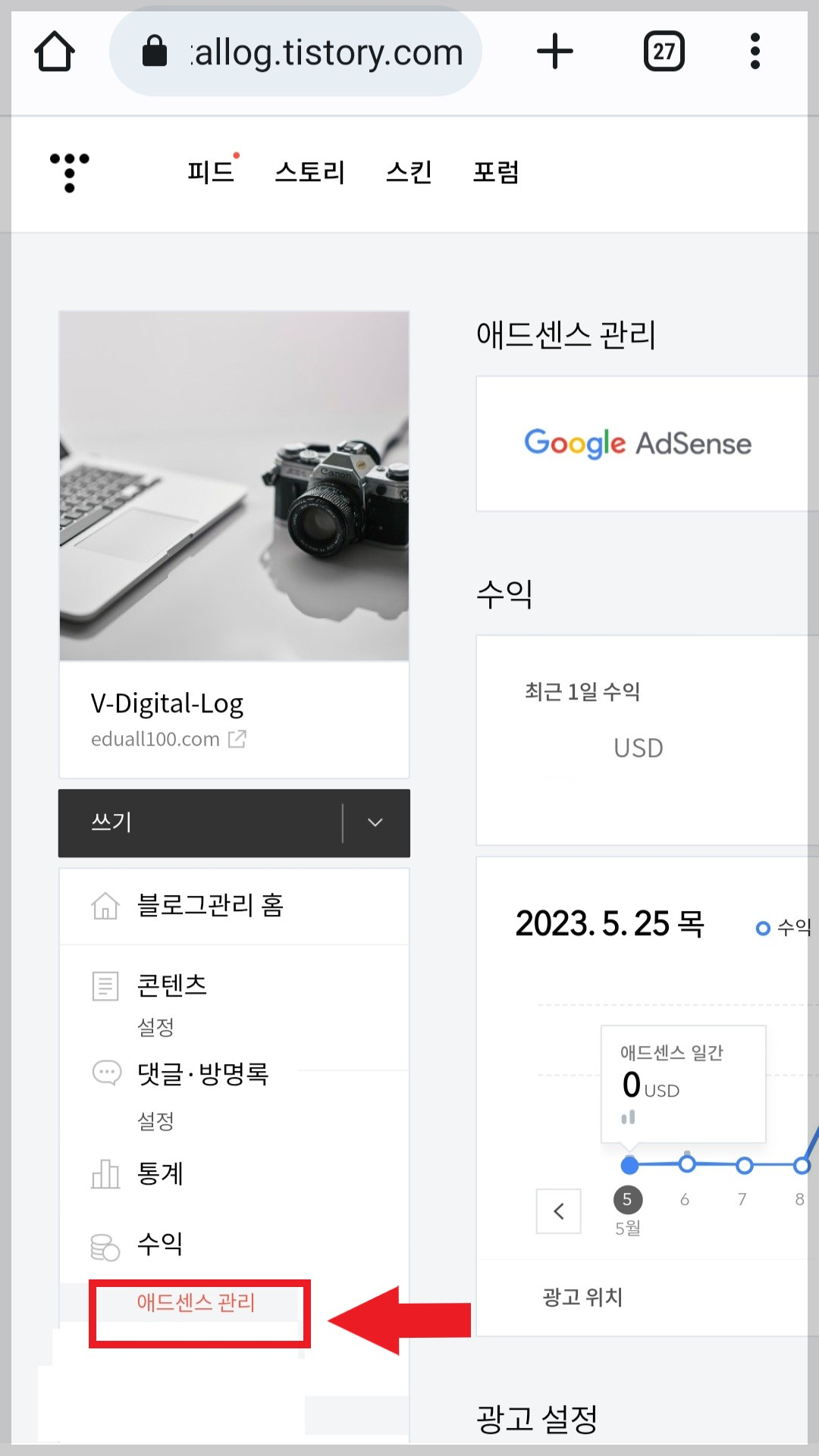 티스토리 관리 화면은 보통 PC에서 사용을 하는데요. 애드센스 수익 또한 바로 확인할 수 있습니다. 하지만 스마트폰의 티스토리 앱에서는 관리 화면을 바로 볼 수는 없는데요. 스마트폰의 앱에서 PC 화면으로 전환해서 애드센스 수익을 확인하는 방법이 있습니다.
