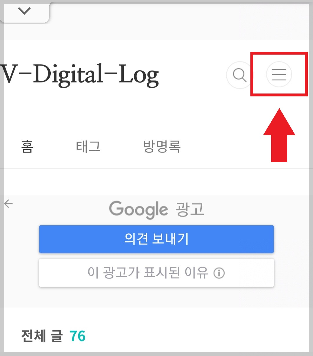내 사이트 주소를 누르면 다른 창이 열리면서 PC 화면과 같은 티스토리가 나옵니다. 오른쪽 상단의 목록(삼선)을 눌러 줍니다.