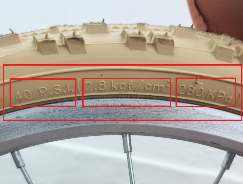 타이어 종류는 공기압이 옆면에 표시가 되어 있는데요. 자전거 외에 오토바이, 자동차 타이어 등 그에 맞는 주입량이 표시되어 있습니다.