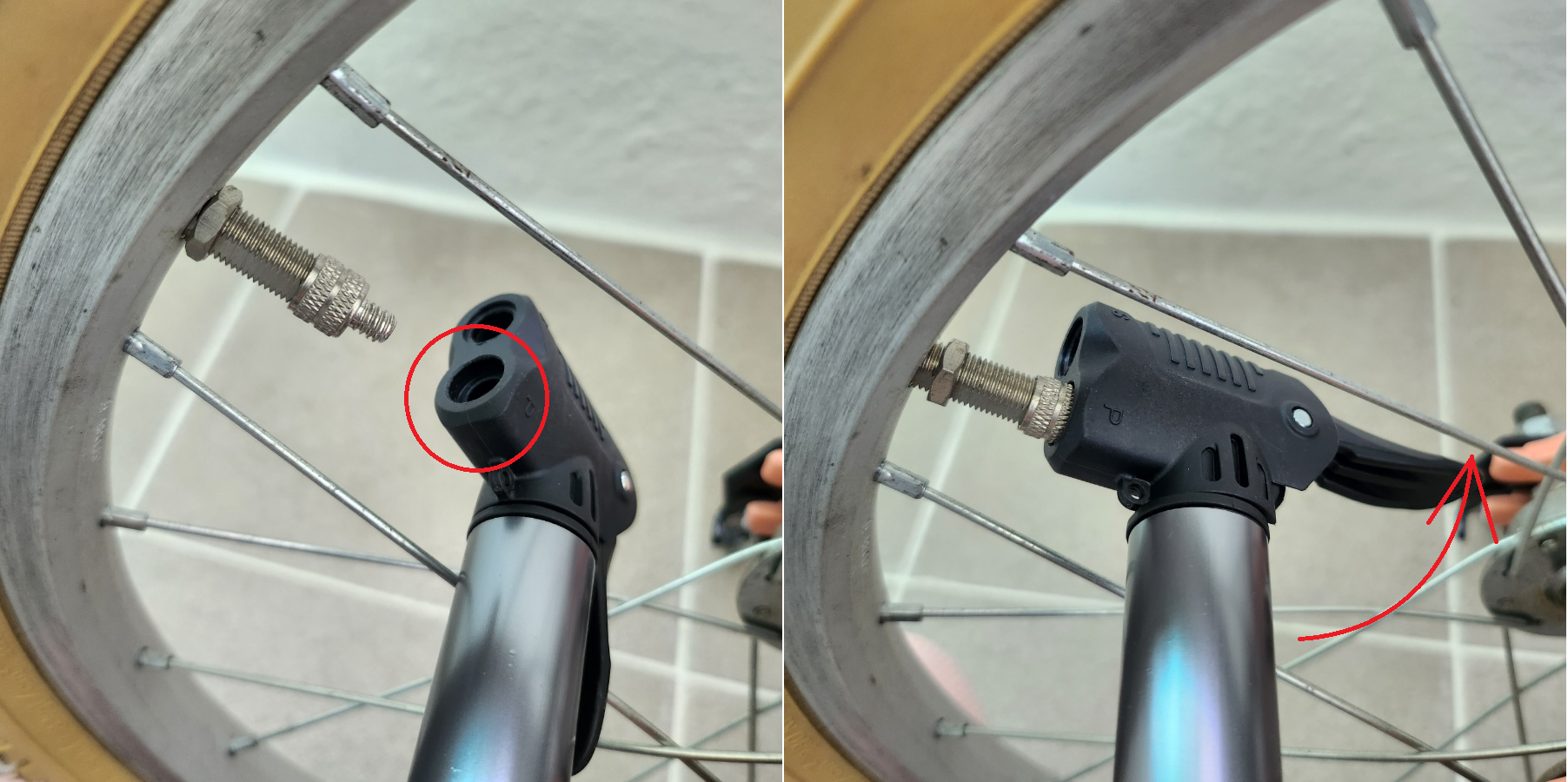 위 사진의 던롭 밸브에 맞추어서 주입구를 연결해 준 다음 손잡이를 올려 고정시켜 줍니다. 이후에 바퀴가 단단해질 때까지 공기를 주입해 줍니다.