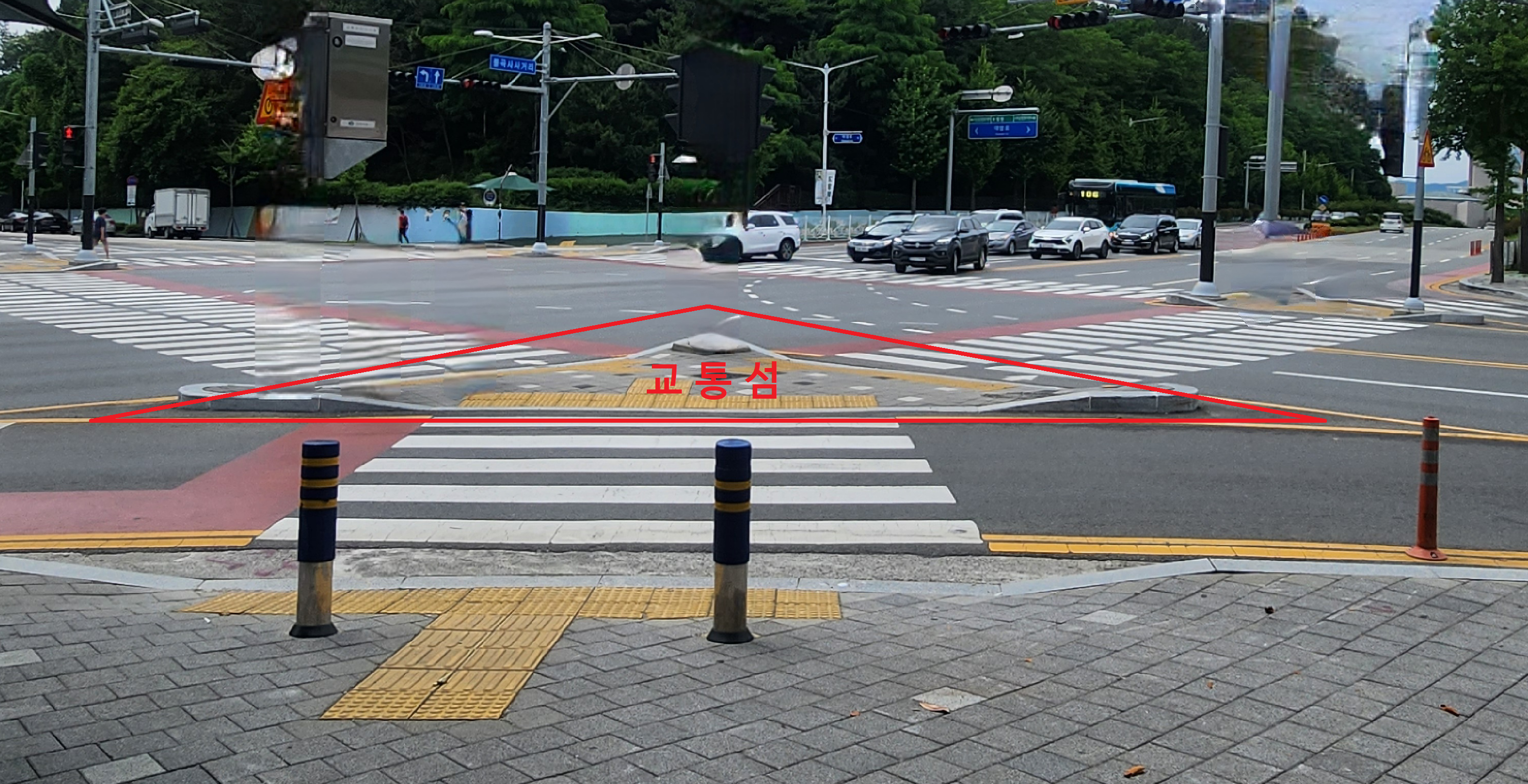 위 질문들이 사람들이 궁금해하는 것들입니다. 답을 하자면 이 횡단보도 즉, 교통섬과 인도 사이의 횡단보도는 일반 횡단보도와 같다고 생각하면 됩니다.