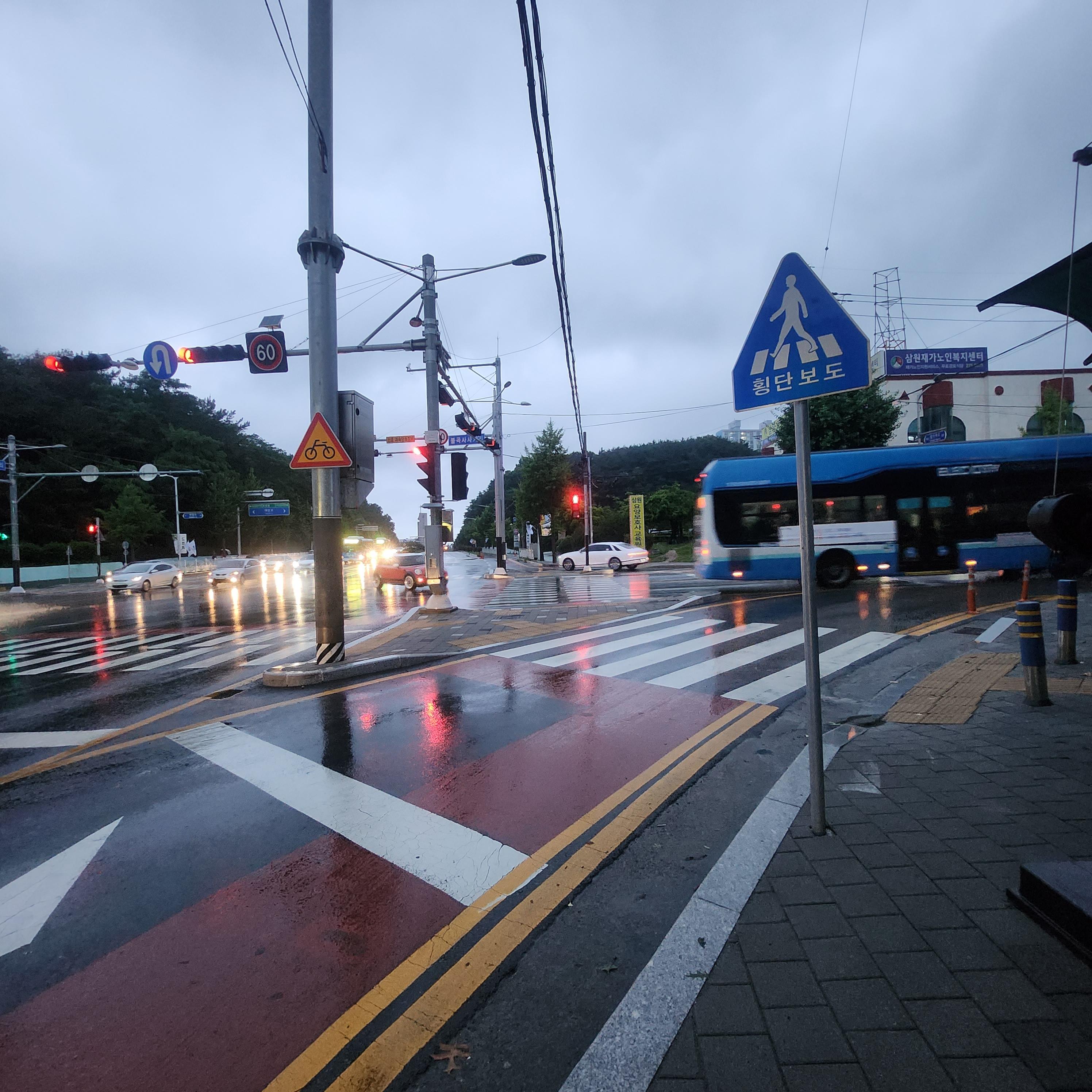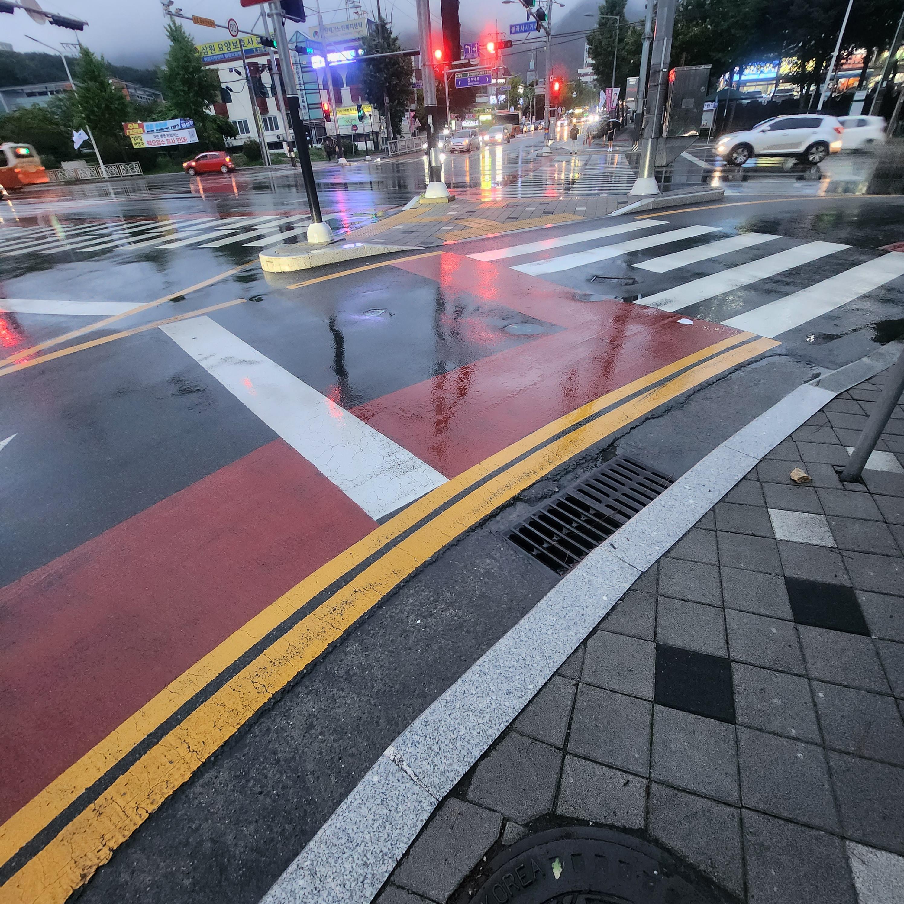 원활한 교통 흐름을 위한 우회전 차선이기도 하고 보행자를 위한 횡단보도이기도 합니다. 하지만 신호등이 횡단보도와 연결이 되어 있어 헷갈리기도 하는데요. 이 횡단보도는 신호등 횡단보도의 보행자 신호 즉, 녹색 불일 때 멈추고 적색 불일 때는 그냥 지나가도 되는 것이 아닌 일반 횡단보도와 마찬가지로 '일단 멈춤'이 맞는 것입니다.